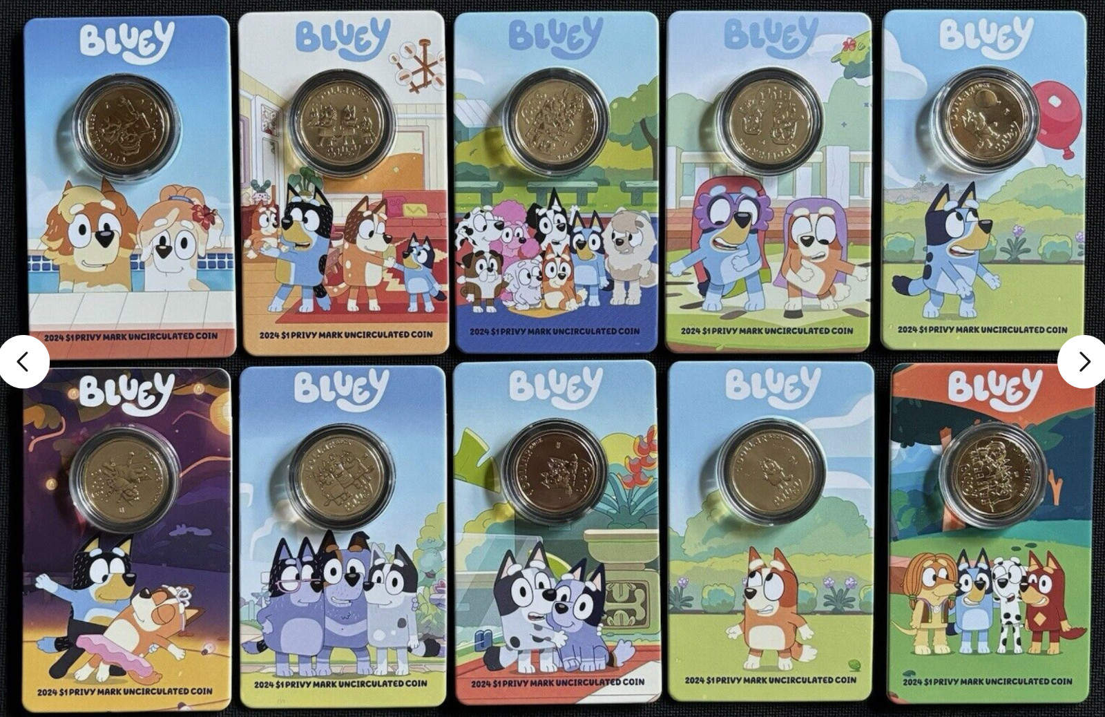 Description: Celebrate the charm of Bluey with the 2024 Bluey $1 Dollar Carded Coin Set of 10 UNC Privy Mark. This set features decimal coins with a unique design, making it a must-have for Australian coin collectors. Showcasing Bluey, the beloved Australian cartoon character, these coins are a delightful addition to any collection. Each coin in this Bluey 10 Carded Coin Set is in uncirculated condition, adding to its value and appeal. With a privy mark and a set year of 2024, this set is a special find for those who appreciate Australian numismatic treasures. Don’t miss out on the opportunity to own a piece of Australian culture with this rare and unique coin set.