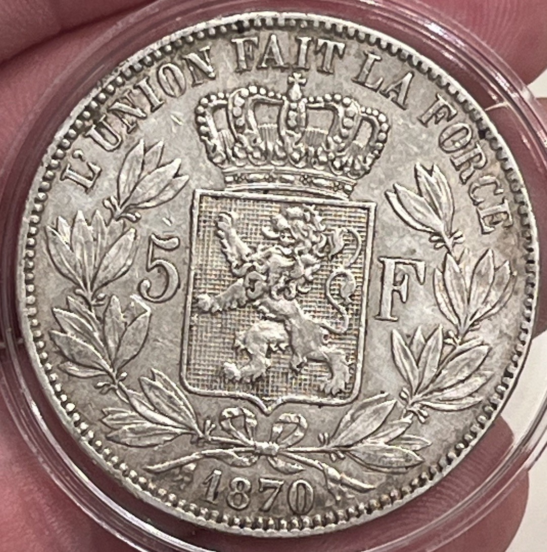 Description: Excellent 1870 5 francs silver coin from Belgium. Comes in plastic capsule. Don’t mind the half foam in the capsule it didn’t all fit but I wanted it snug in the capsule.