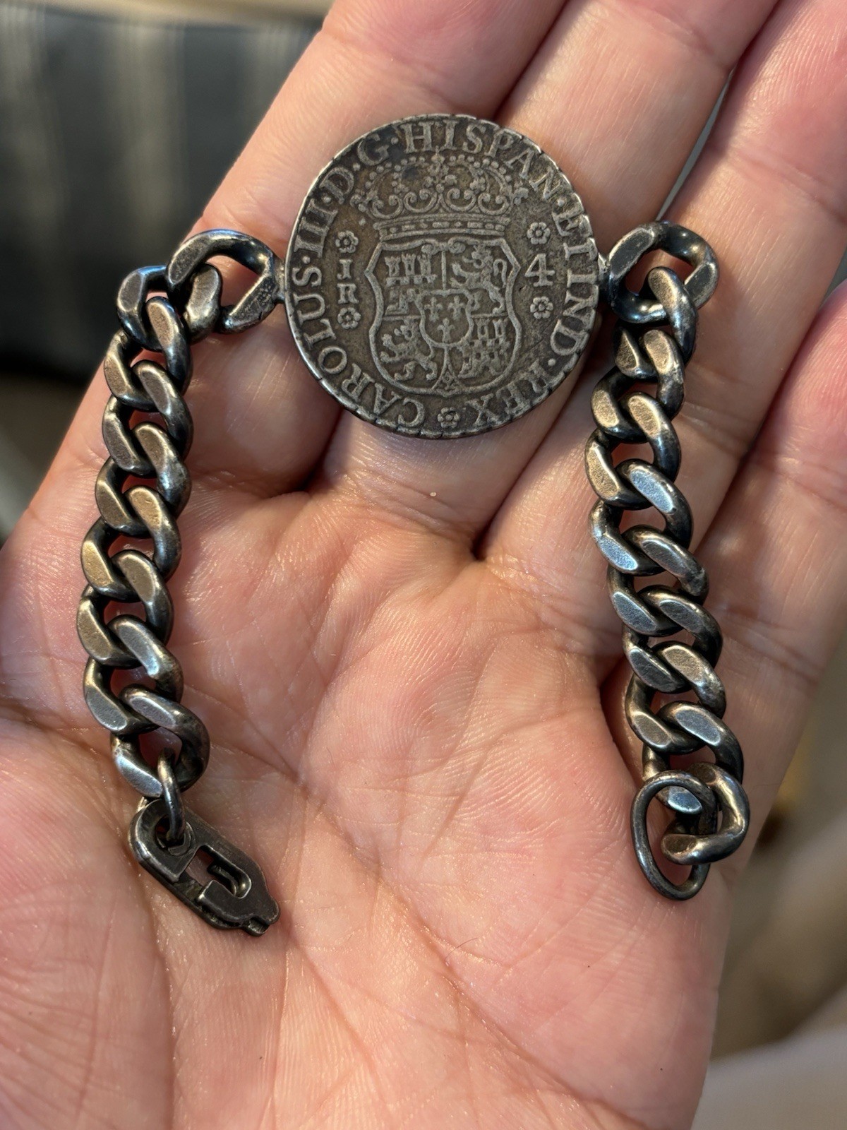 Description: The product is a unique 1767 PTS JR Bolivia 4 Reales Silver Coin that has been transformed into a bracelet. This coin originates from Bolivia and is made of silver. Despite being uncertified, it holds historical and cultural significance, making it a special piece of jewelry with a rich backstory. The bracelet allows the wearer to carry a piece of South American history on their wrist, adding a unique and additional layer to any outfit.