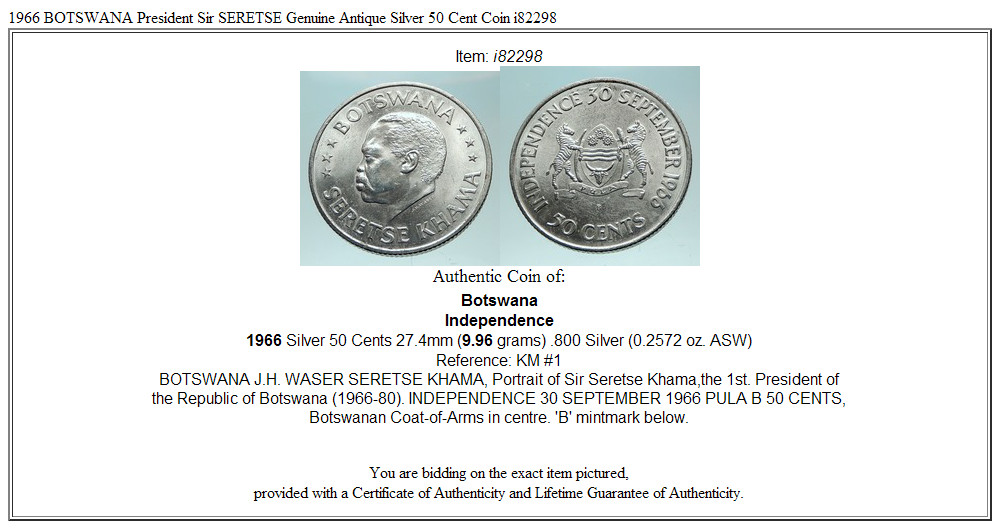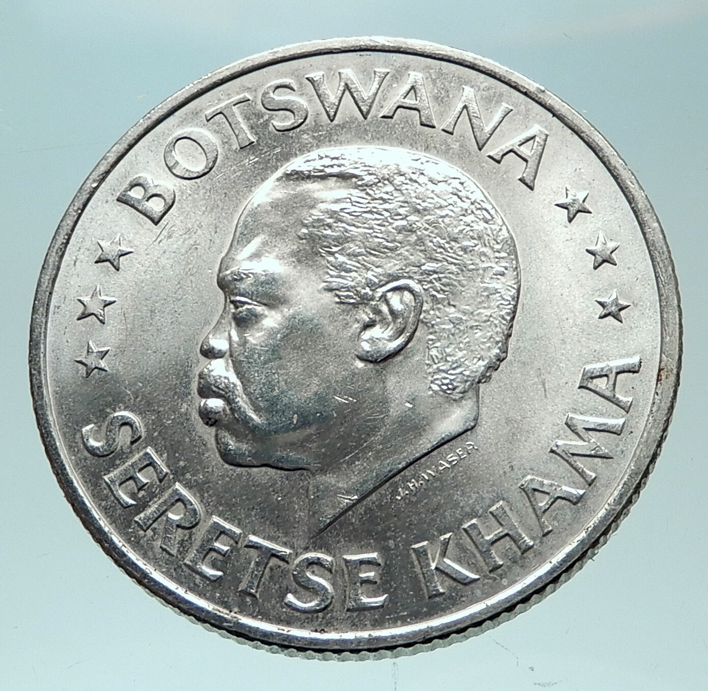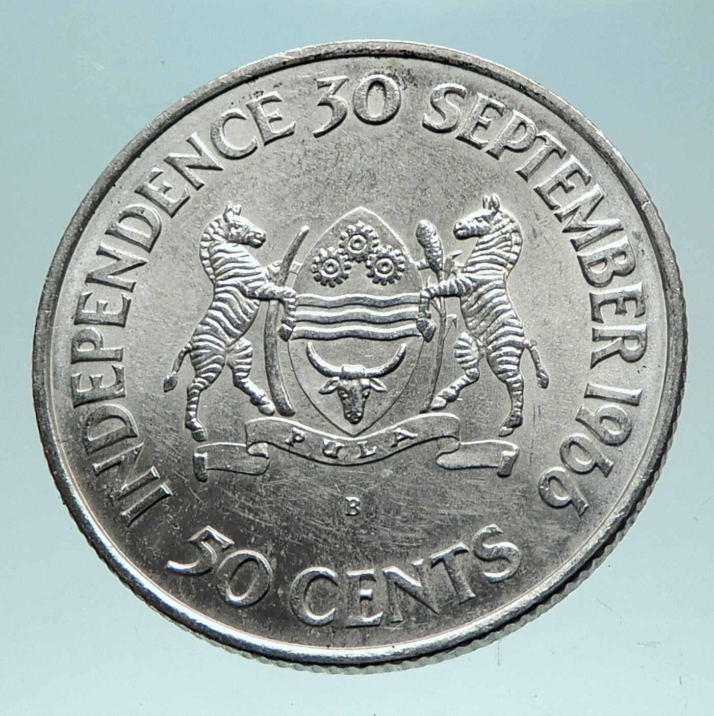 Description: President of the Republic of Botswana (1966-80). INDEPENDENCE 30 SEPTEMBER 1966 PULA B 50 CENTS, Botswanan Coat-of-Arms in centre. ‘B’ mintmark below. Botswana, officially theRepublic of Botswana (Setswana:Lefatshe la Botswana ), is a landlocked country in Southern Africa.