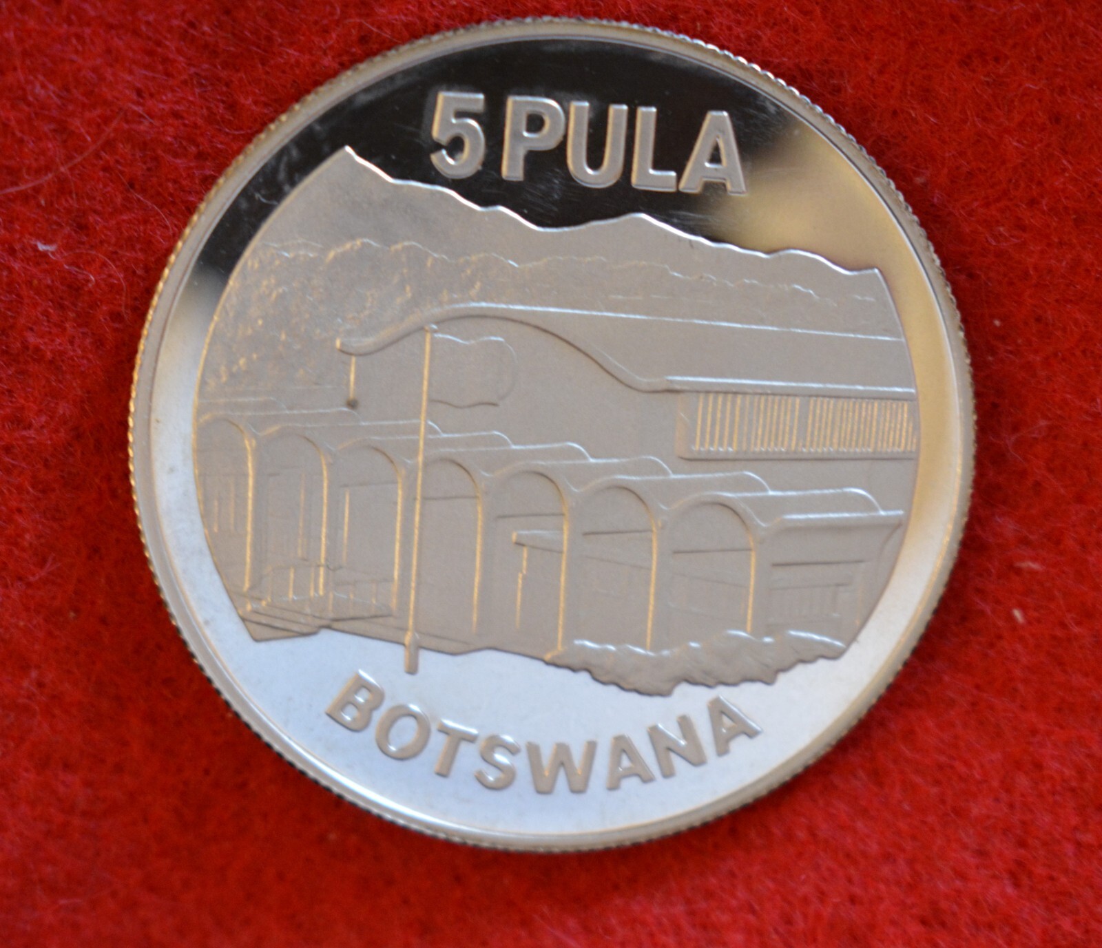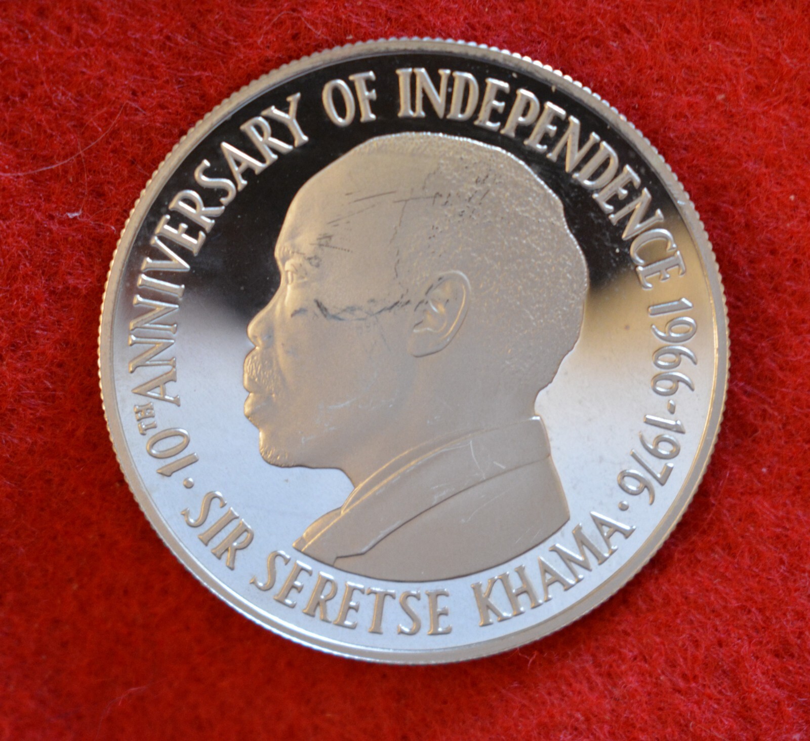 Description: Slight rub mark on President Khama’s cheek. Struck at the Royal Liantrisant Mint and contains 0.841 oz fine silver.