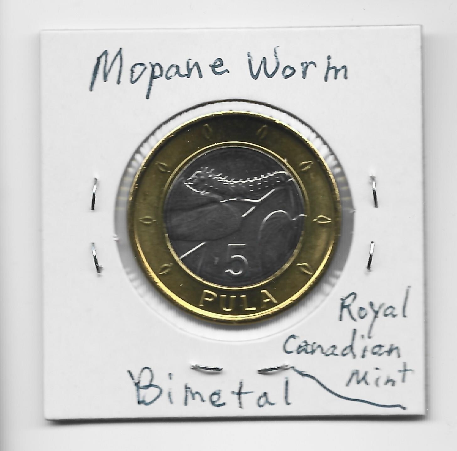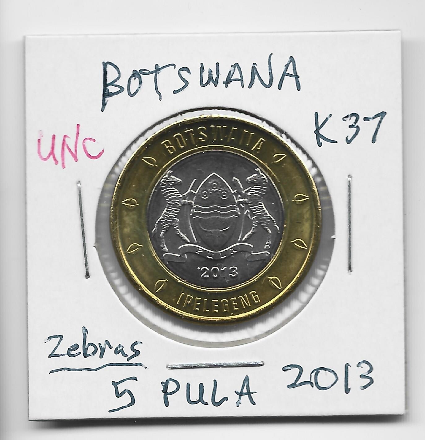 Description: Uncirculated Botswana 5 pula 2013 coin. 2 Plains Zebra animals on front, a Mopane Worm [caterpillar, insect] on back. I hope you enjoy the coin.
