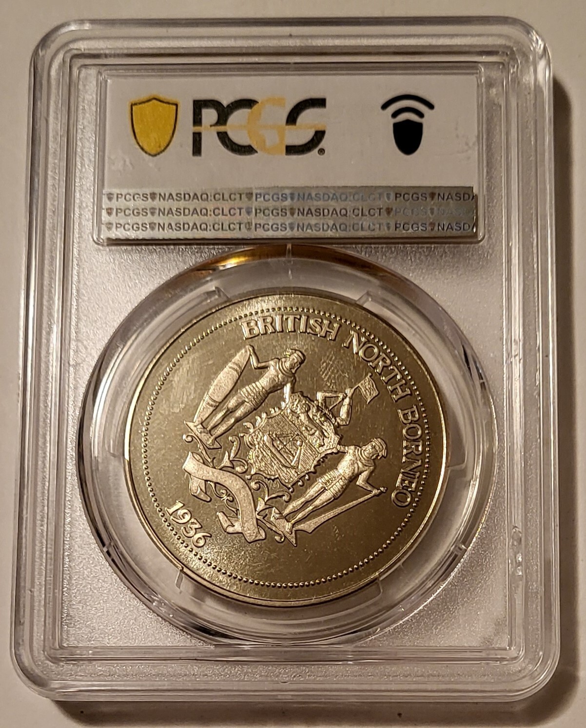 Description: “1936” Edward VIII. FM27b PE, Copper-Nickel Proof-68 PCGS. Holder has chip along reverse standing shelf – does not affect holder integrity.