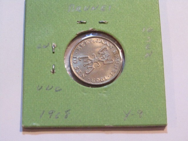 Description: Brunei 1968 10 Sen unc Coin, coin in a re-used coin holder marker on the backside.