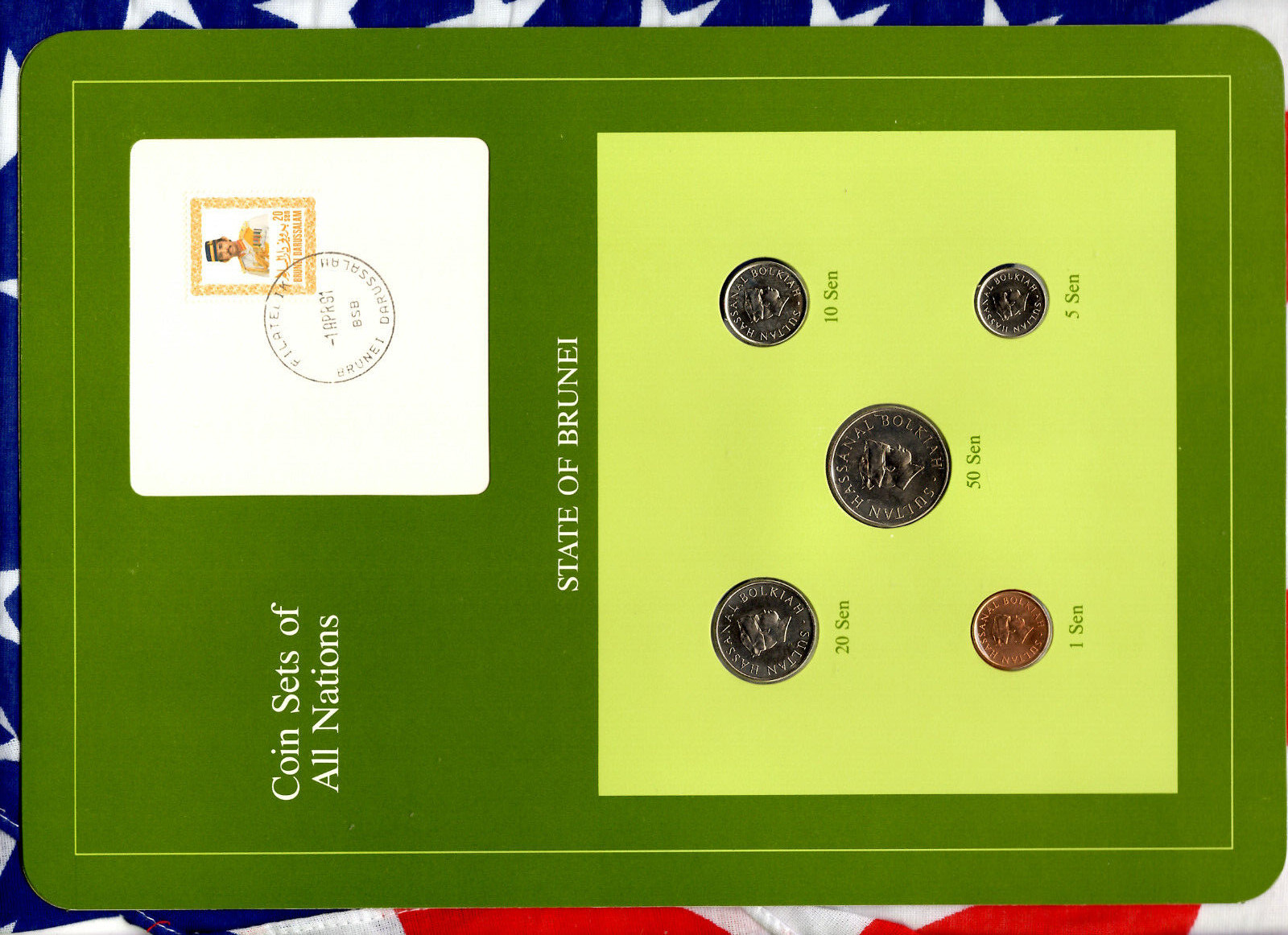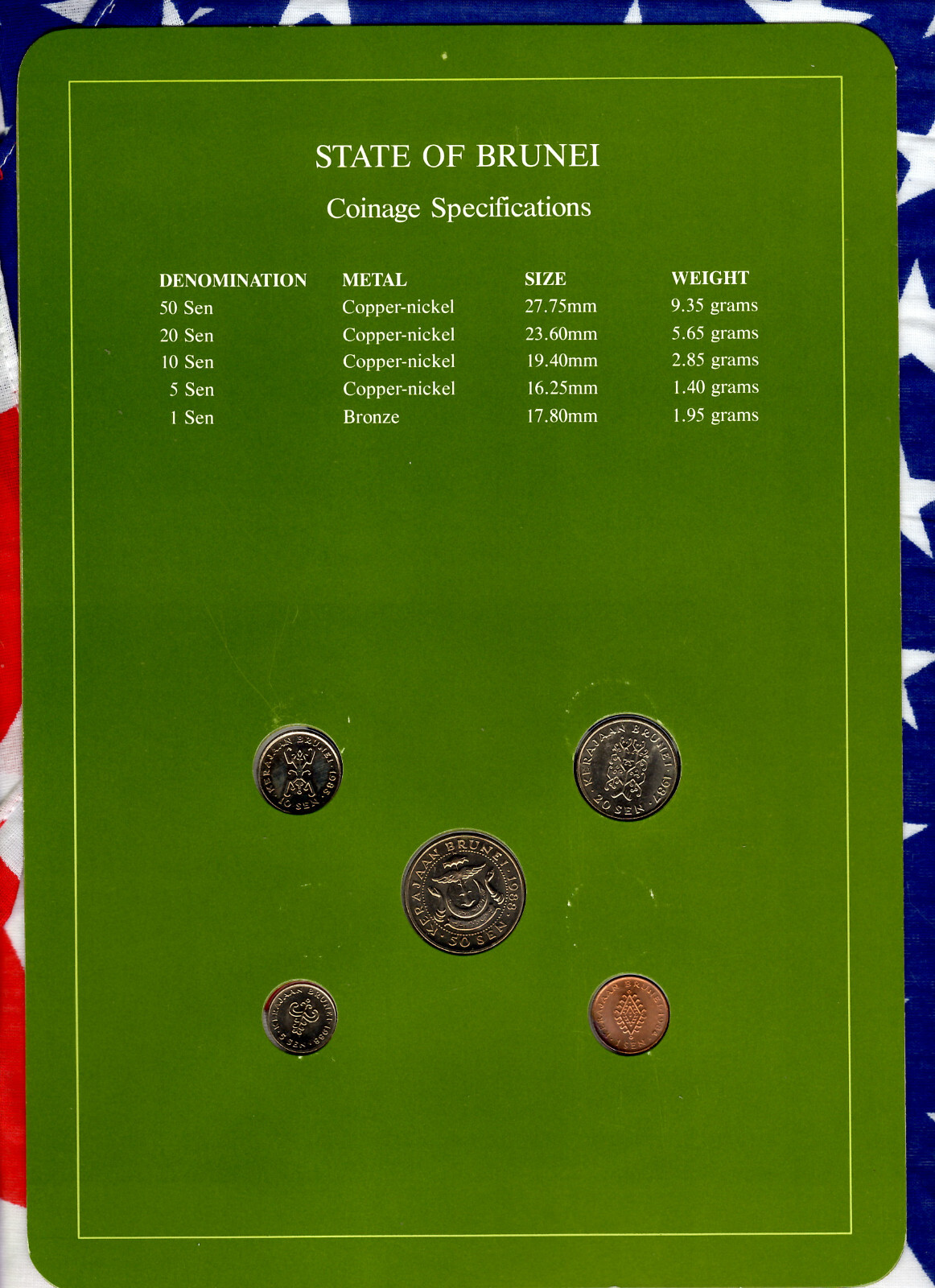 Description: 50 Sen – 1988 20 Sen – 1987. 5 Sen – 1988. 10 Sen – 1985. 1 Sen – 1984. State of Brunei. unc coin set. Coin Sets of All Nations Collection. “Coin Sets of All Nations” series.