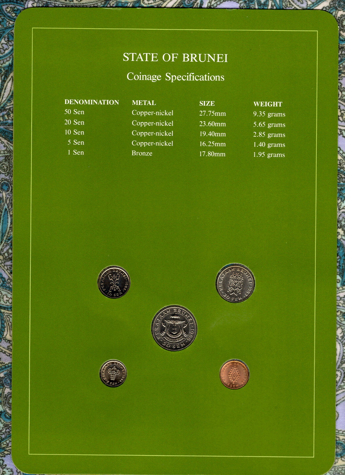 Description: 50 Sen – 1988 20 Sen – 1987. toning rear edge 1 Sen from missing cover. 5 Sen – 1984. 10 Sen – 1985. 1 Sen – 1984. State of Brunei. Coin Sets of All Nations Collection. “Coin Sets of All Nations” series.