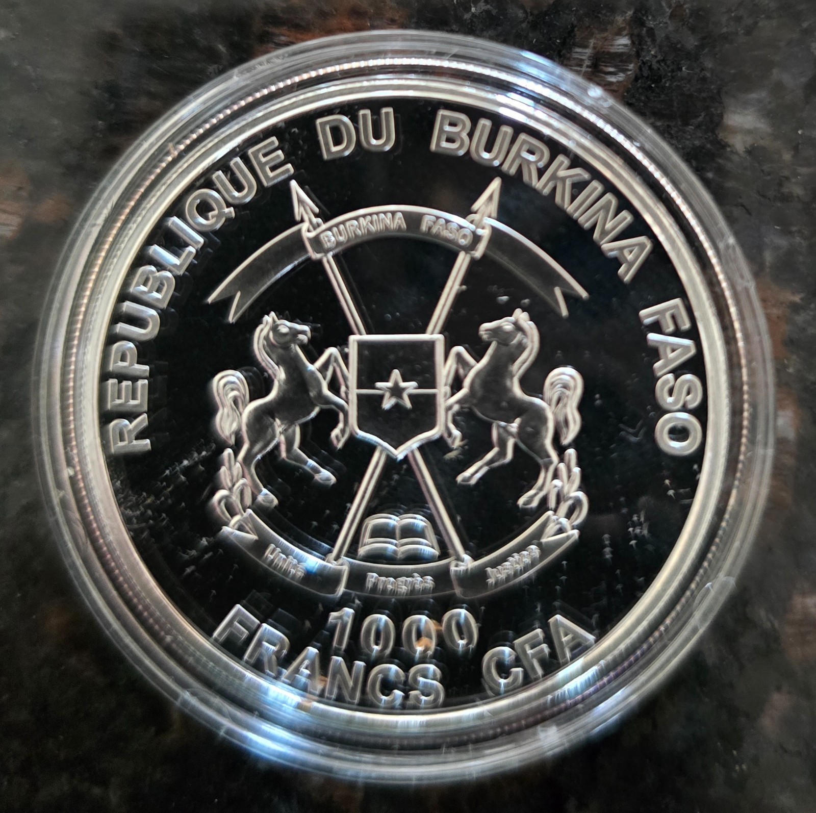 Description: This coin is from Burkina Faso with 1000 francs CFA and proof-like finish.