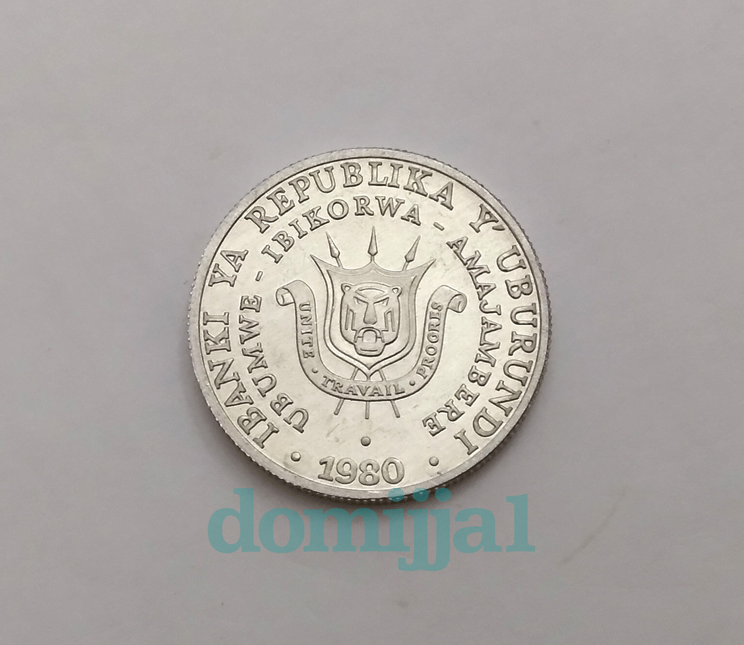 Description: 1980 Burundi 5 Francs. KM #20 / Uncirculated. Uncleaned original coin.