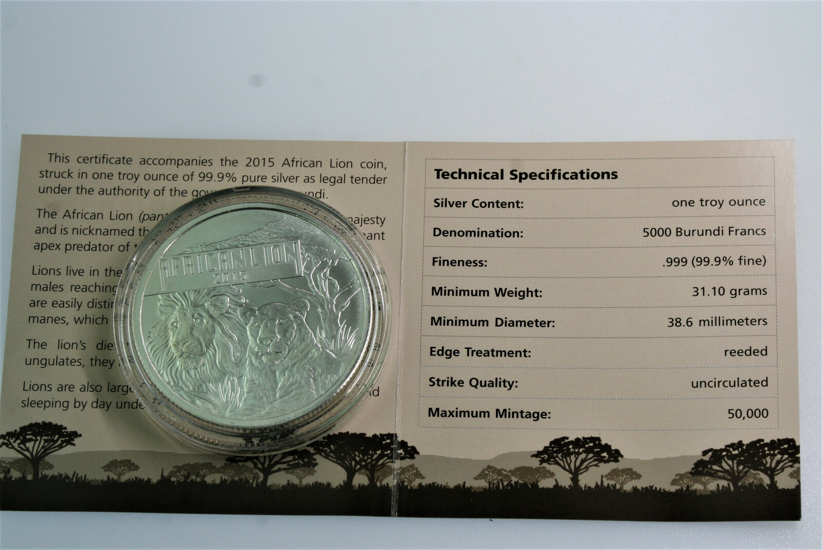 2015 Burundi African Lion 1 oz fine silver 5000 francs BU W/ COA