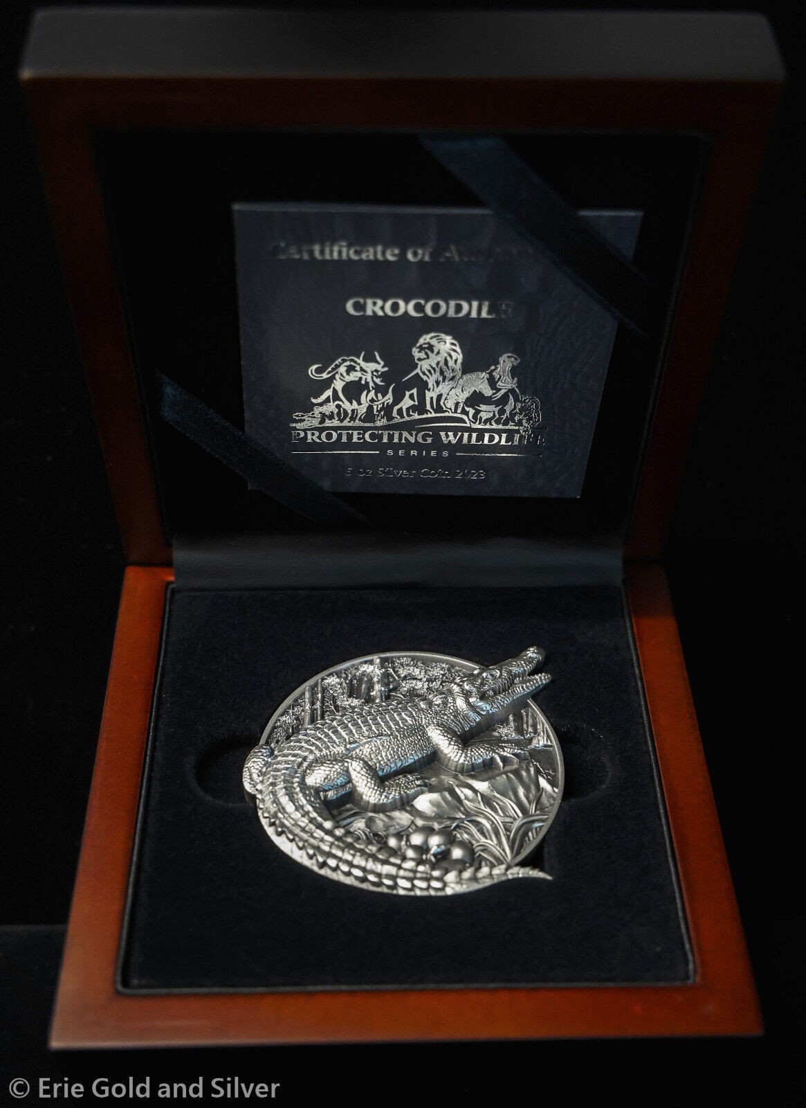 Description: 2023 Burundi Protecting Wildlife Crocodile 5 oz Silver Antiqued Coin in OGP