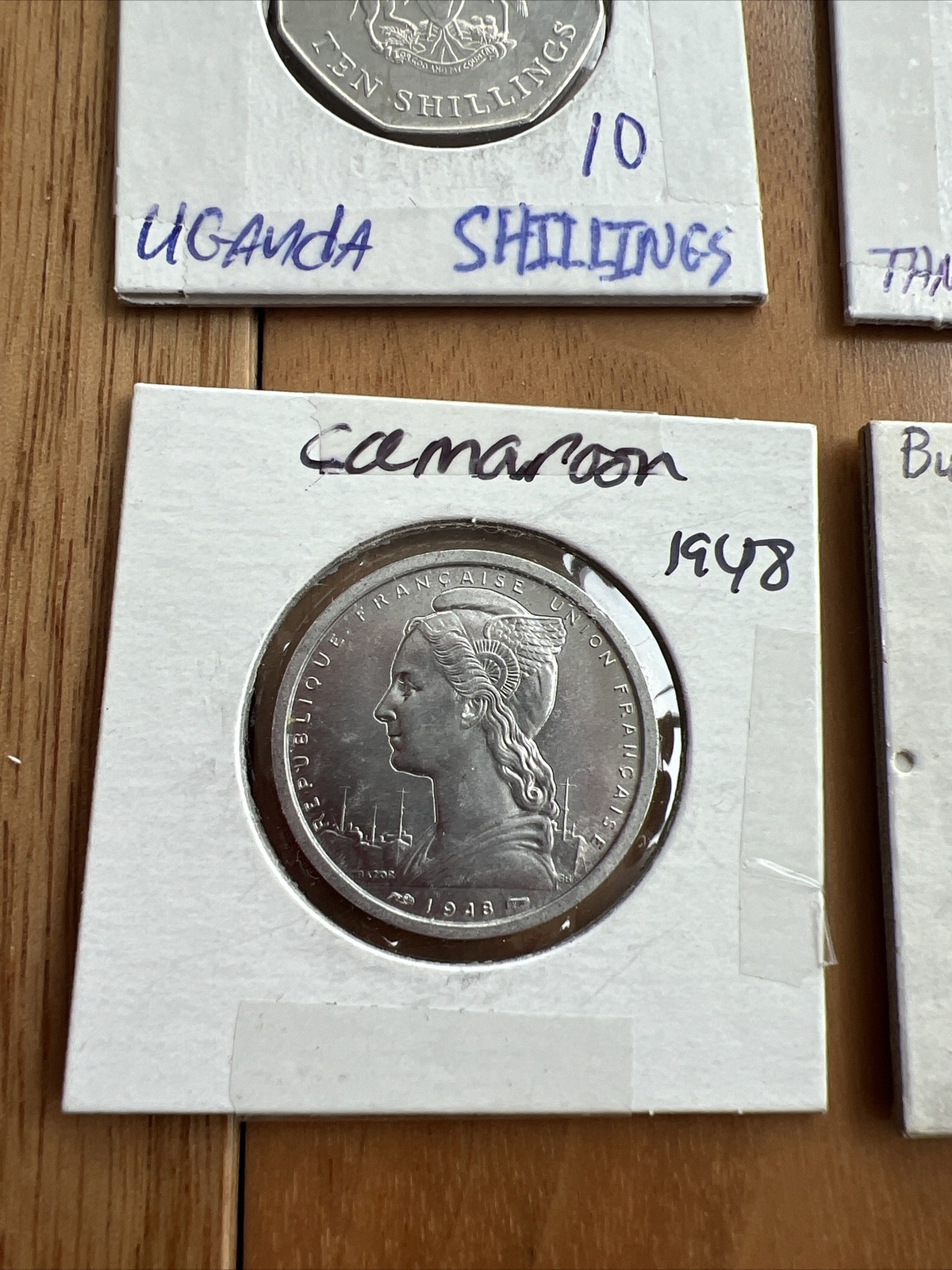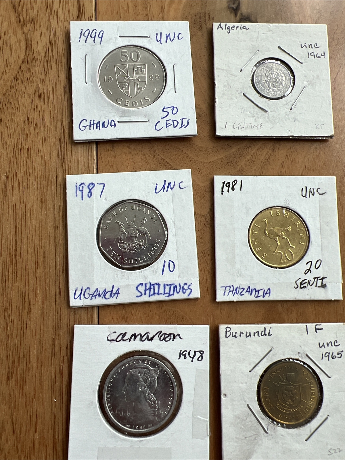 Description: You will receive the exact coins pictured. This is a very nice lot of brilliant uncirculated coins from Africa Ghana 1999, Algeria 1964, Uganda 1987, Tanzania 1981, Cameroon 1948, Burundi 1965. The coins are in very nice condition as shown in the pictures.