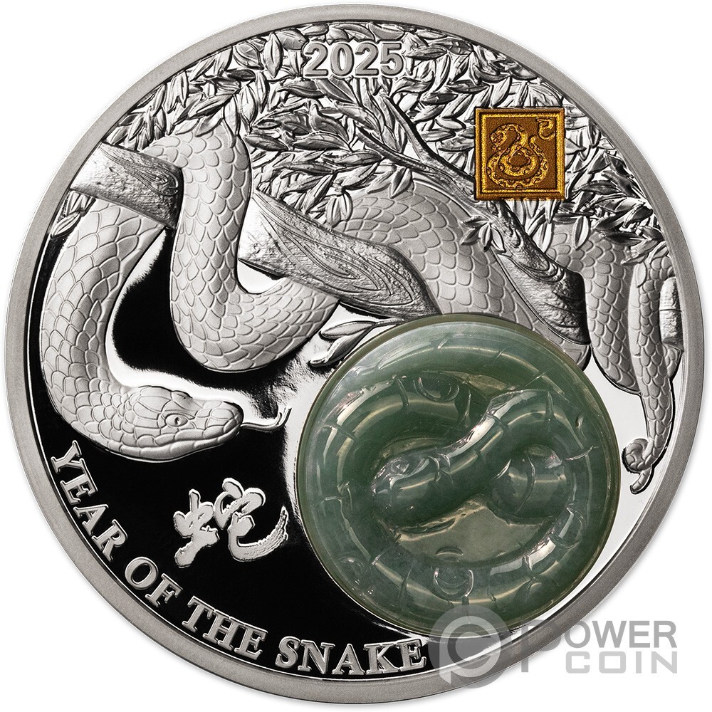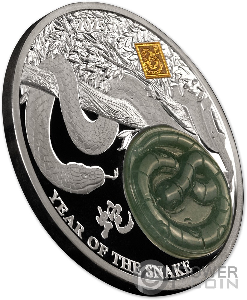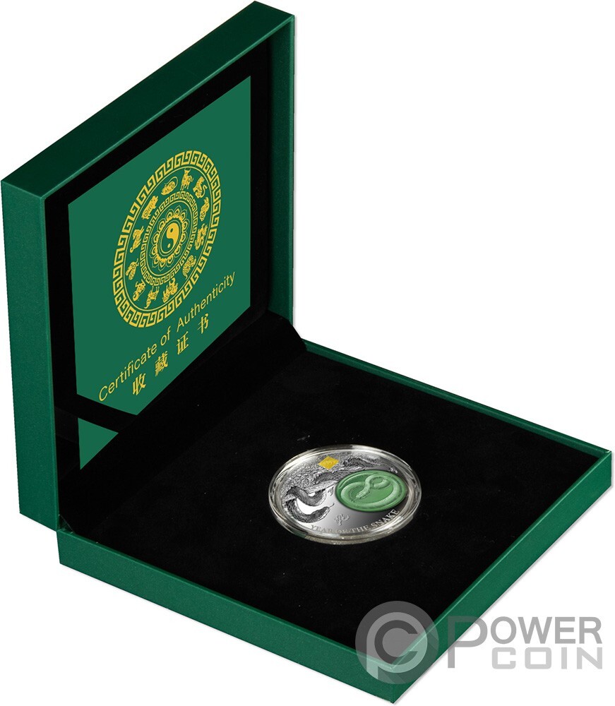 Description: This impressive 2 Oz Silver coin is the new issue in the “Jade Lunar” series and is dedicated to those born under the year of the Snake, representation of power, wisdom and longevity. The coin has Proof quality, features a natural Jade stone insert and has a selective 24k Gold Plating.