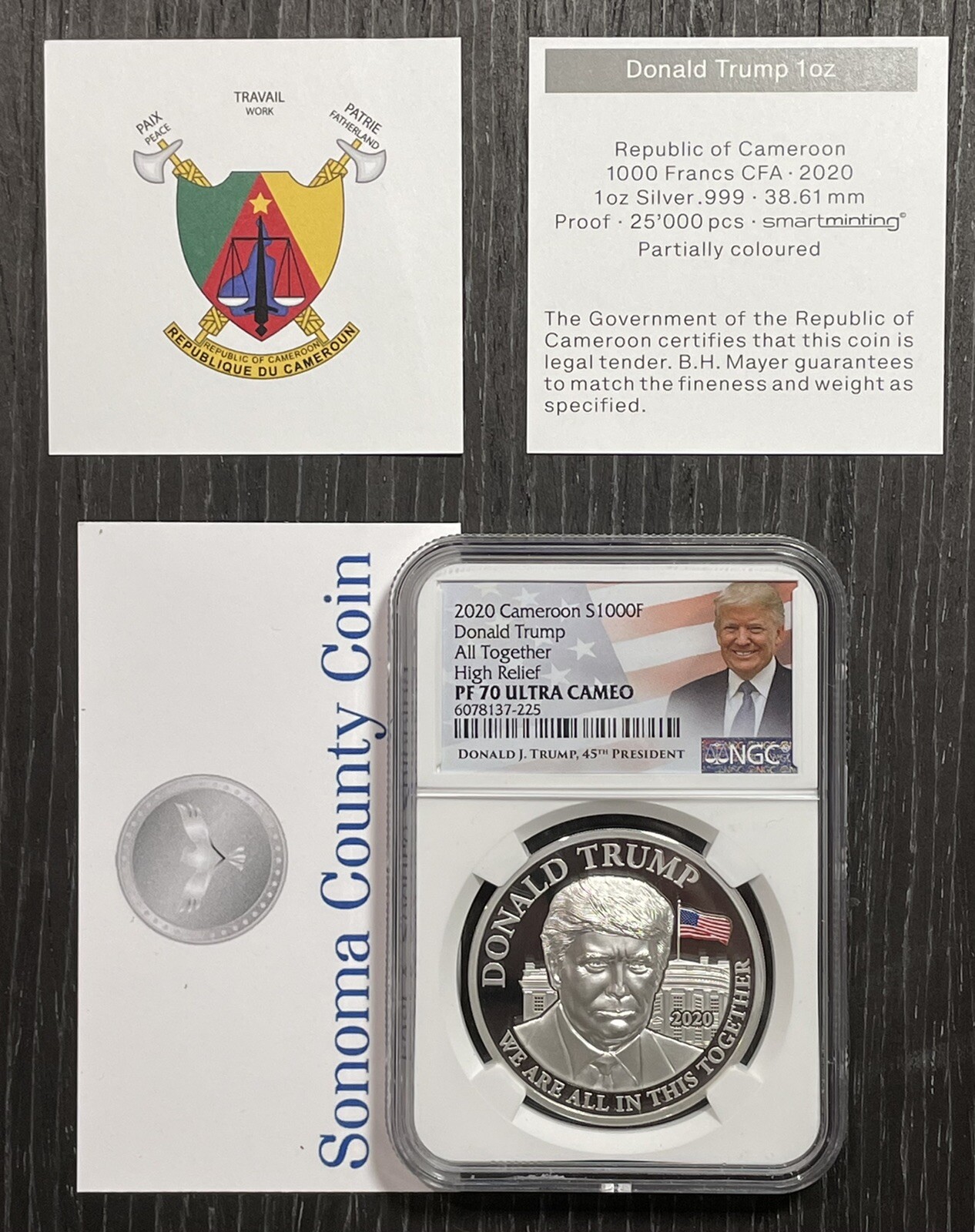 Description: 2020 CAMEROON PROOF SILVER DONALD TRUMP NGC PF70 HIGH RELIEF 1 OZ .999 W COA. Maximum of 25,000 PC Minted Comes with generic Certificate of Authenticity as shown. All graded perfect by NGC, the serial # of the coin will be different as more than 1 available. All questions please ask before purchase, all sales final. Sonoma County Coin