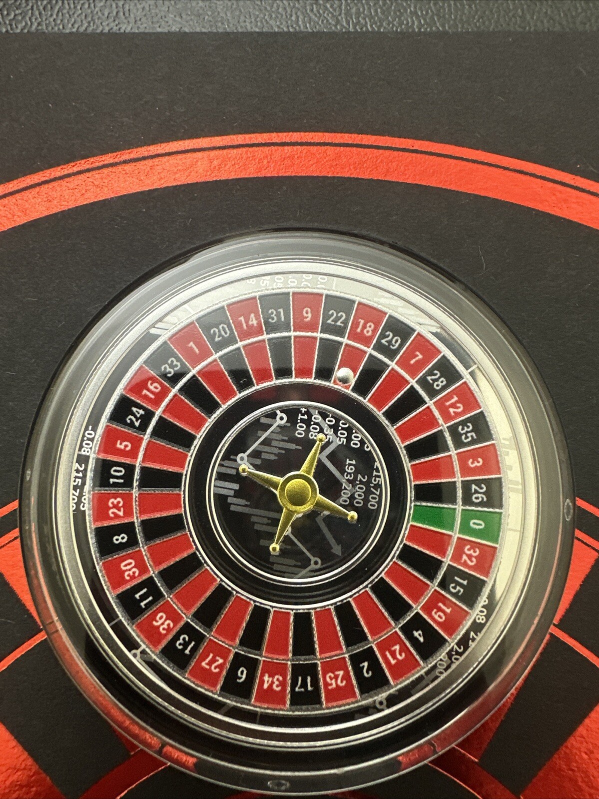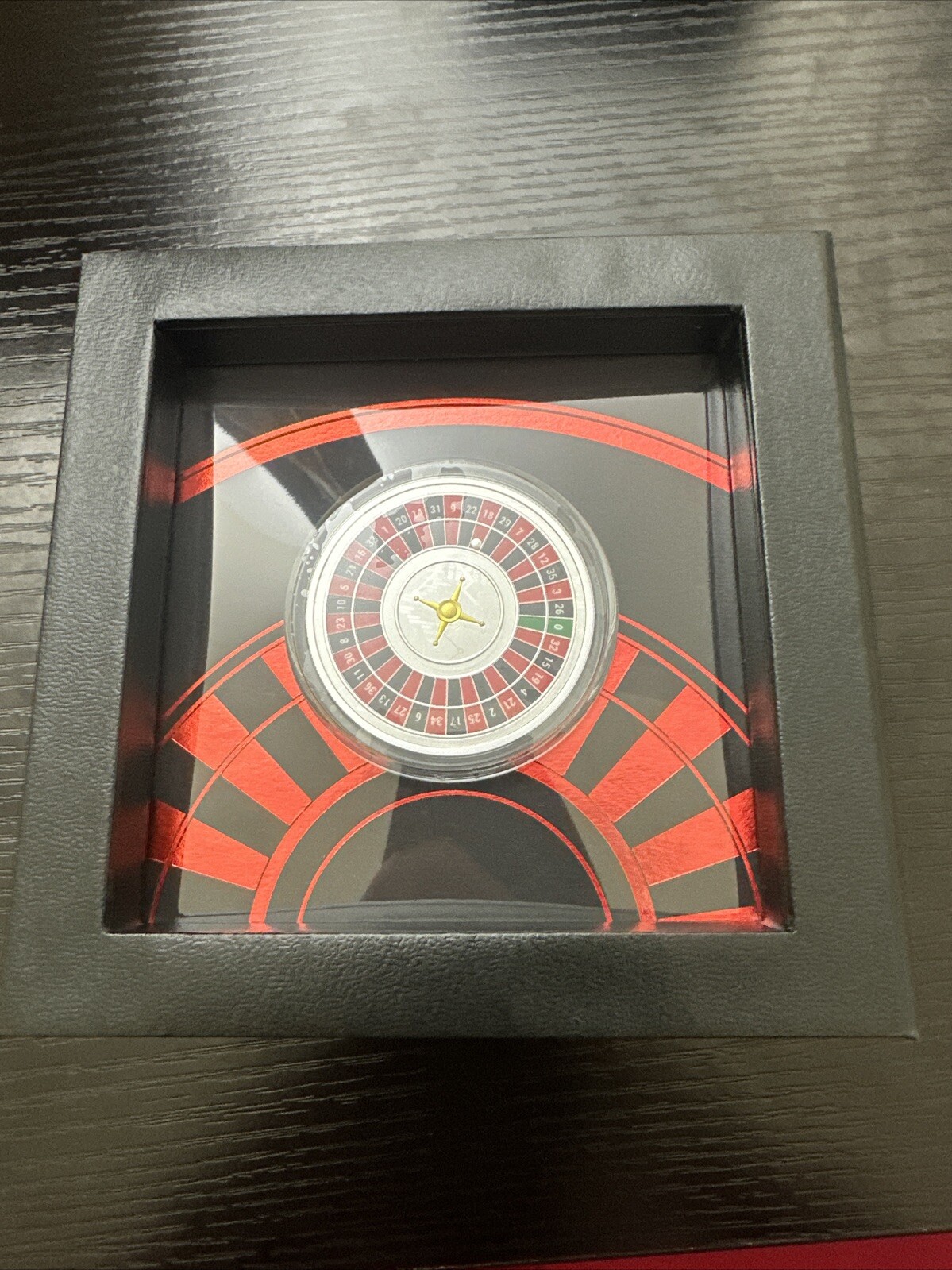 Description: The picture is exactly what you will receive . Perfect condition. Introducing the 2022 Cameroon Roulette Wheel 1oz Silver Colorized Proof Coin, a limited edition collectible from the Mint of Poland. This stunning coin features a round shape with a striking proof strike type and a fineness of 0.999. The coin is composed of .999 silver material and has a total precious metal content of 1 oz. The Roulette Wheel franchise coin is uncirculated and comes in a display box with a Certificate of Authenticity. It is a must-have for any coin collector or Roulette enthusiast. This coin is a true masterpiece and a great addition to any collection. Don’t miss your chance to own this unique and rare piece of silver.
