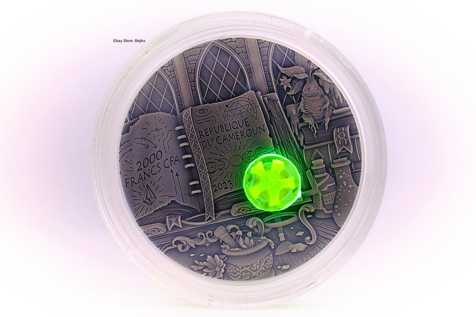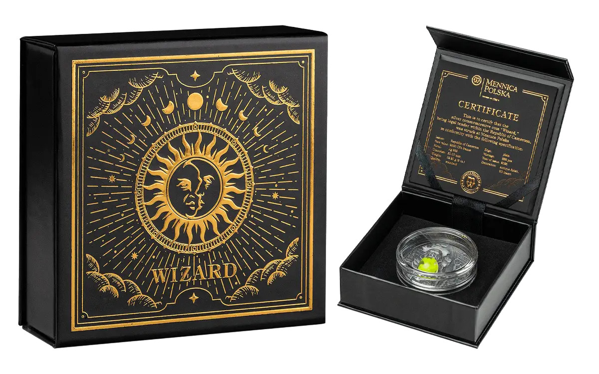 Description: The design is enhanced byultra high relief details, a hand-applied antique finish, and a uniquefluorescent 3D insert that glows with a mystical effect — appearing as the wizard’s crystal ball. Finish:Antiqued with fluorescent 3D insert.
