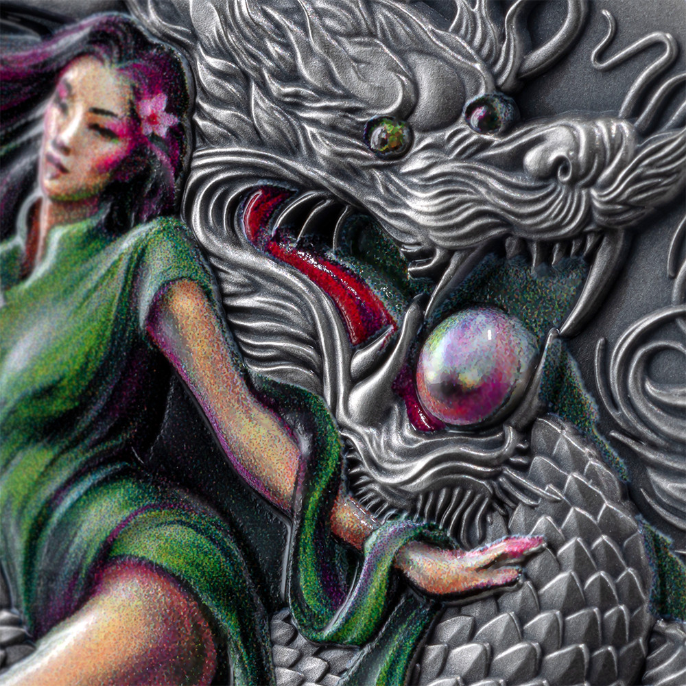Description: The third coin in the Dragonology Series. High Releif Antique finish with selective coloring. 2 oz. 999 fine silver.