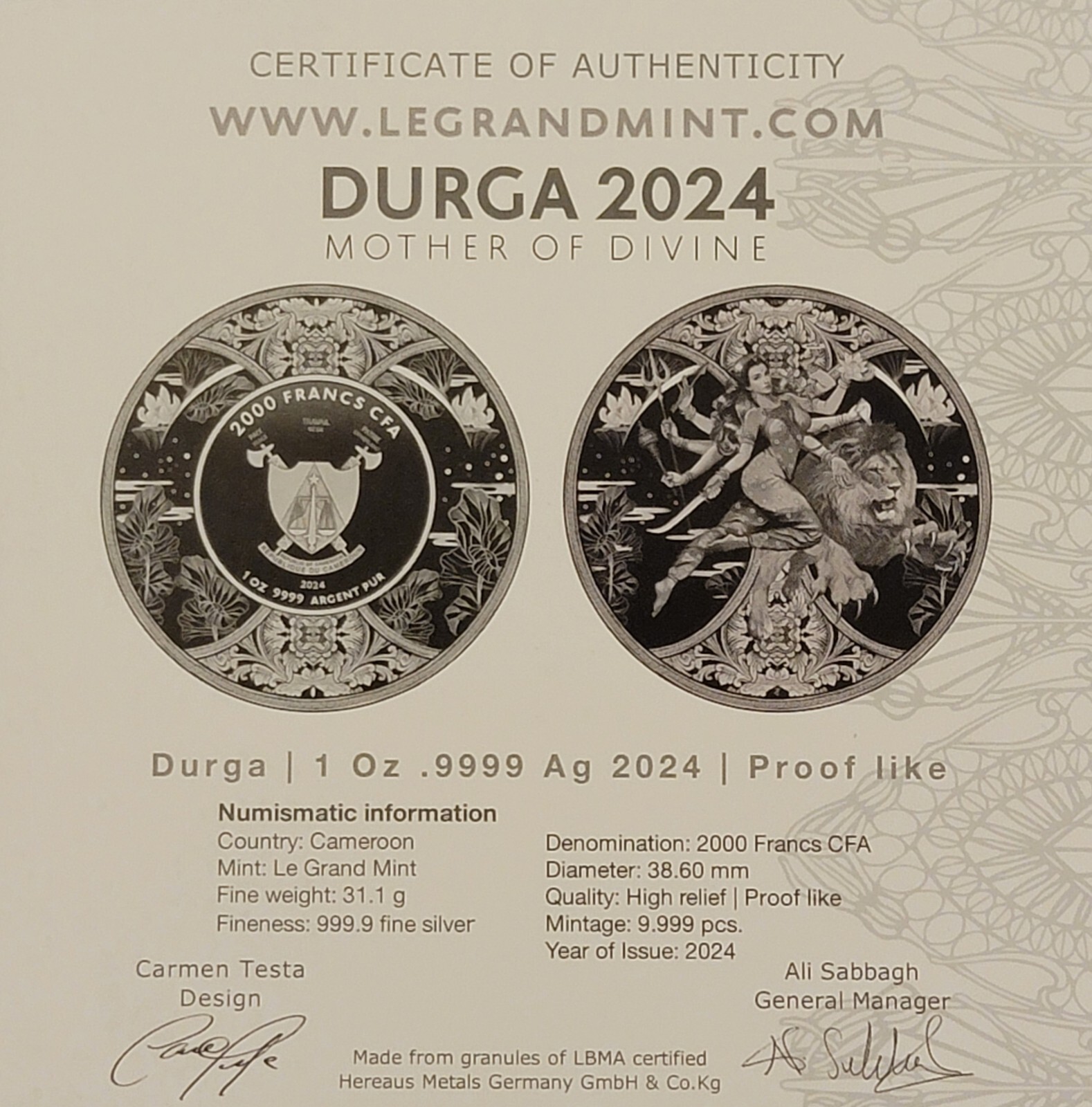 Description: This 2024 Cameroon Hindu Goddess Durga 1oz Silver High Relief BU Coin with a COA is a beautiful addition to any collection. Crafted by the Gdansk Mint in Germany, this coin features the iconic image of Durga with intricate details and a stunning silver composition of 0.999 fineness and a proof like finish. The ungraded coin comes in its original packaging with a COA for authenticity. Perfect for collectors and investors alike, this piece of art is sure to be a conversation starter. Add it to your collection today.