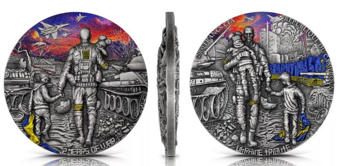 Description: This listing is for 2024 Cameroon Ukraine 2 Oz High Relief Silver Collectible Coin It stands as a tribute to their strength, hope, and unwavering spirit in the face of adversity. This Silver coin features a stunning Ultra-High Relief on both sides, depicting exactly the same scene, changing the viewer’s side. It comes in a case, along with the Certificate of Authenticity. Ultra-limited mintage of only 500 pieces worldwide! Year: 2024 Face Value: 2000 Francs Metal: Silver Fineness: .999 Weight (g): 62.