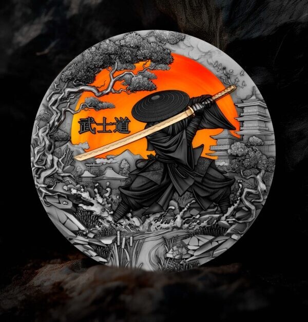 Description: This is the first coin in the new series “The Warrior’s Path” which brings the world of the samurai to life through a vibrant, intricate design that captures the essence of Bushido. Behind him, the fiery rising sun – symbolizing Japan the “Land of the Rising Sun”—bathes the landscape in fiery light.