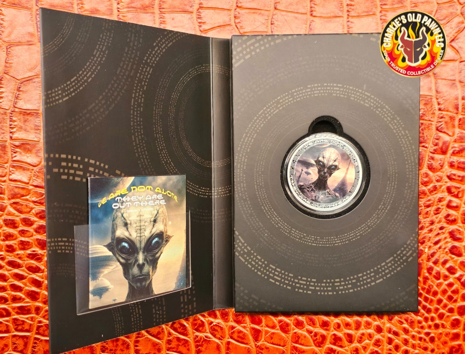Description: This proof-like coin belongs to the UFO & Aliens: We are not alone; they are out there series. Reverse: Features an alien staring straight out and in the background is an alien city. Coin Highlights.