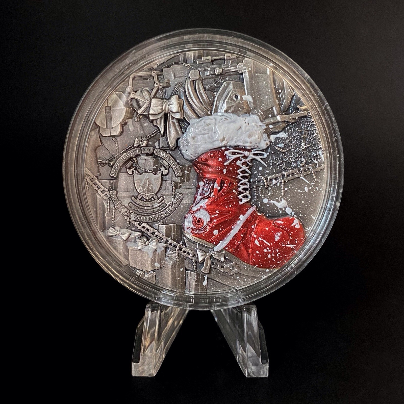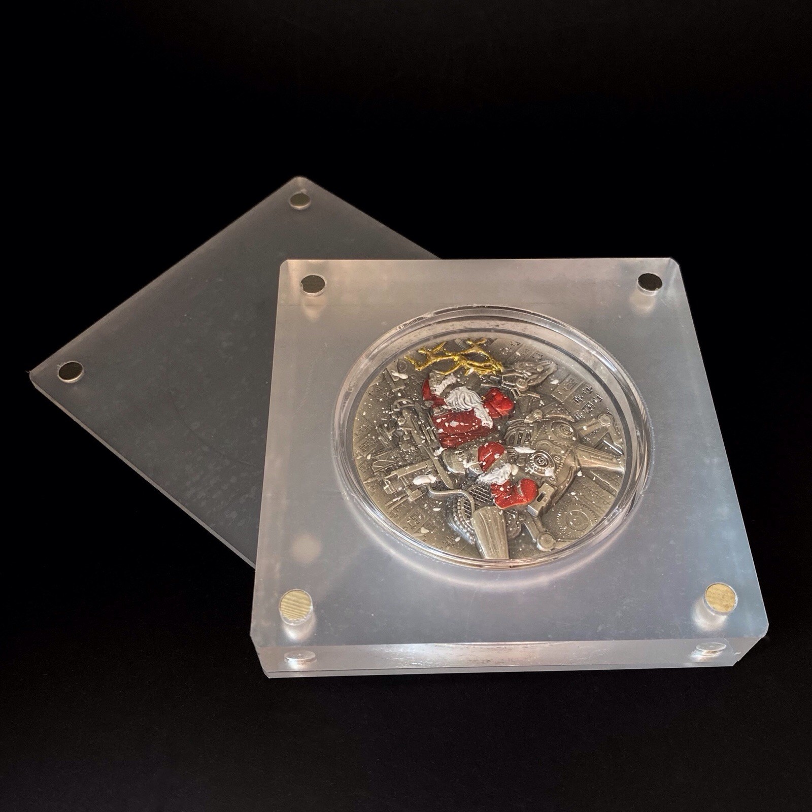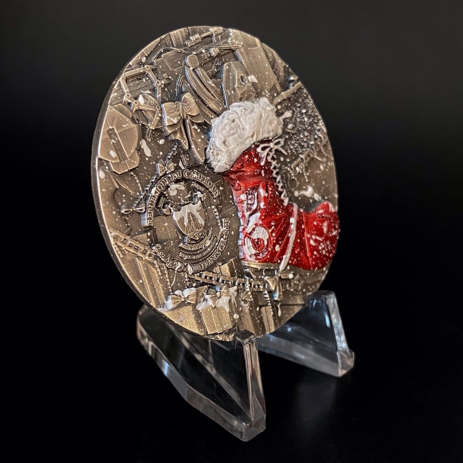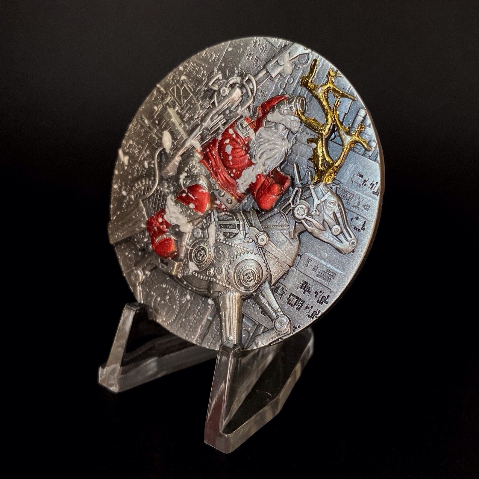 Description: The 2025 Cameroon 2 ozt. .999 Fine Silver “Steampunk Santa” coin is a unique and collectible piece featuring a high relief strike type. This coin, minted by Mint of MK, showcases an antiqued and colorized design, making it a standout addition to any coin collection. With a total precious metal content of 2 oz. troy, this limited edition coin is sure to be a prized possession for enthusiasts of silver bullion and steampunk aesthetics. Reindeer antlers are Gold Foil Coin is encapsulated in Airtite Capsule & held within a magnetic case Low Serial Number of 029 of 199