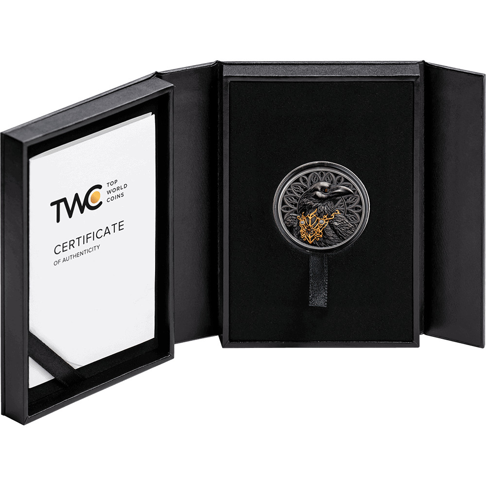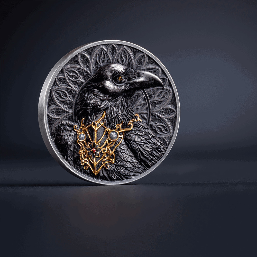 Description: Shadows shift, secrets stir—The Raven knows them all. The Raven 1 oz Silver Coin. Draped in darkness, The Raven soars from the depths of the night. Striking high relief and masterful detailing highlight its feathers, while digital gilding ignites the intricate chestpiece—a web of golden filigree embracing a dark, enigmatic core.