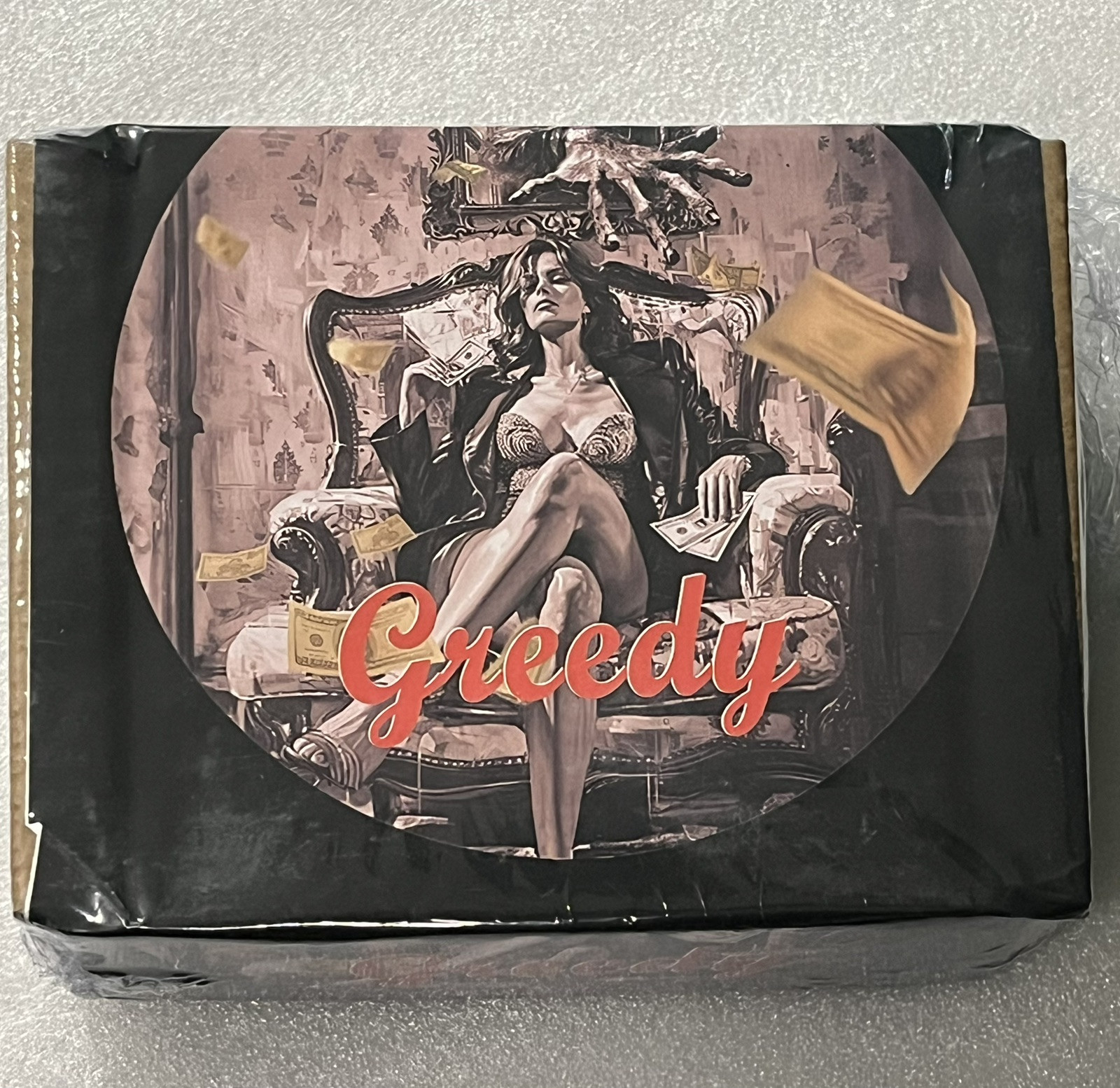 Description: Year: 2025. She holds a banknote with a casual elegance, surrounded by a flurry of money, symbolizing the overwhelming influence of wealth. The Sin City series explores the depths of human nature, each coin inspired by a different deadly sin.