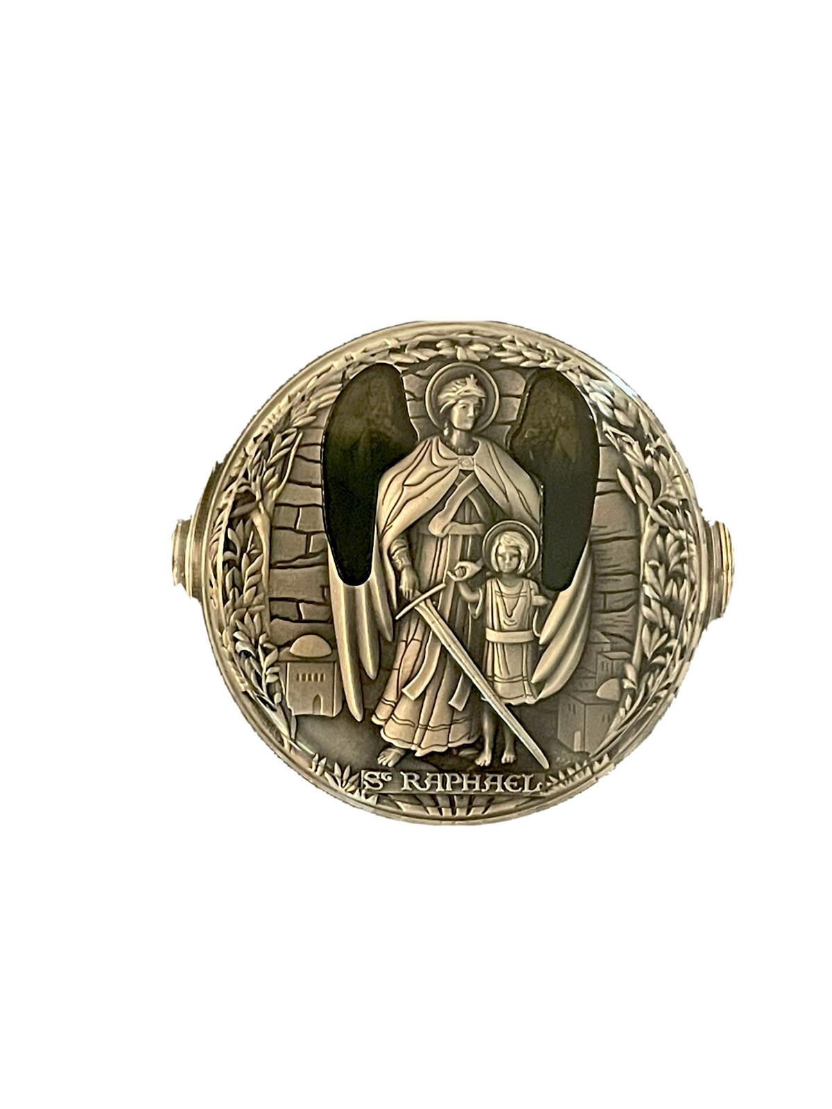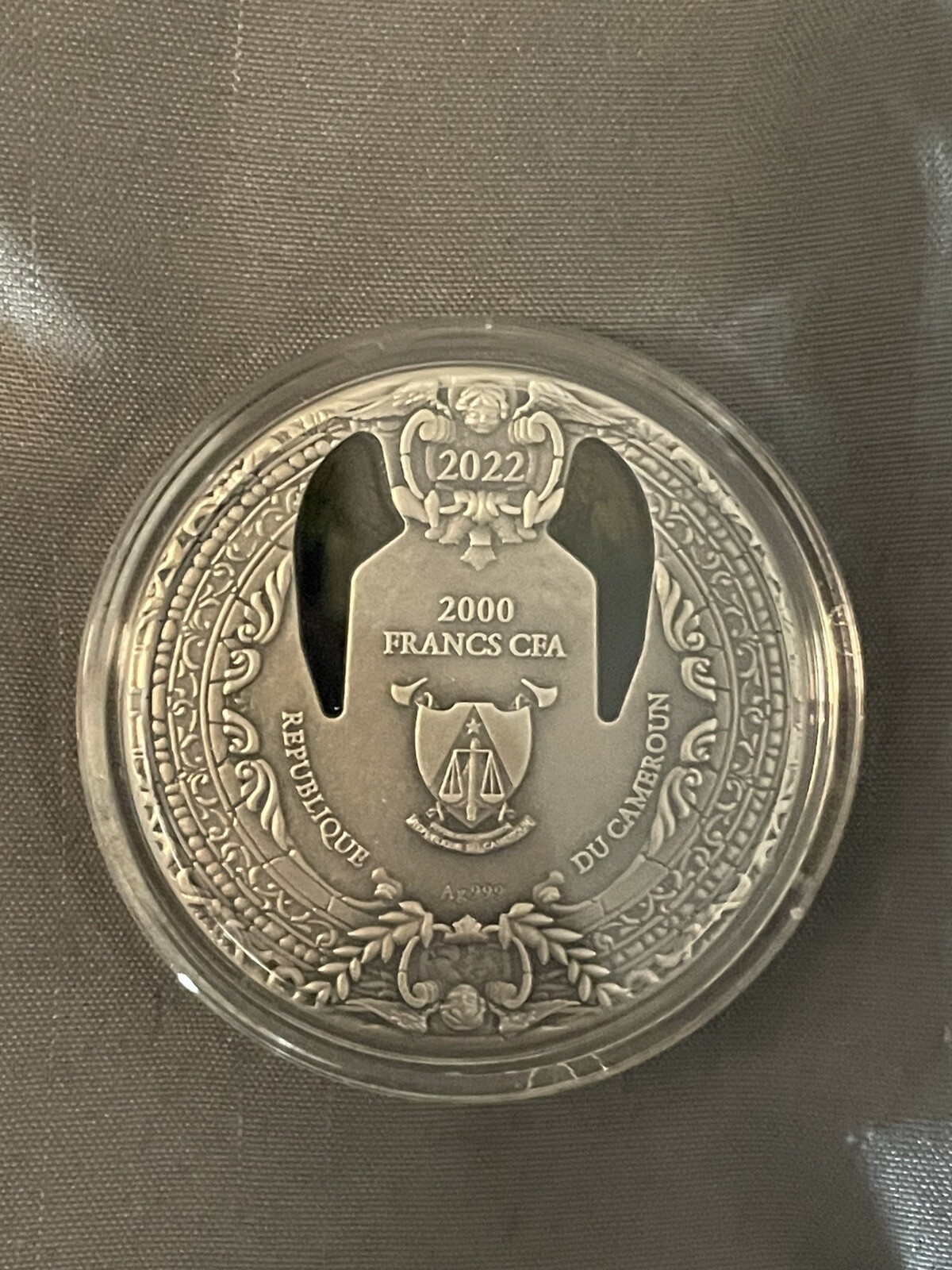 Description: Archangel Raphael 2 oz Antique finish Silver Coin 2000 Francs CFA Cameroon 2022. Live on hand No PreSales Mint of Poland High Relief Colorized Antique Finished with glass insets Item #1111
