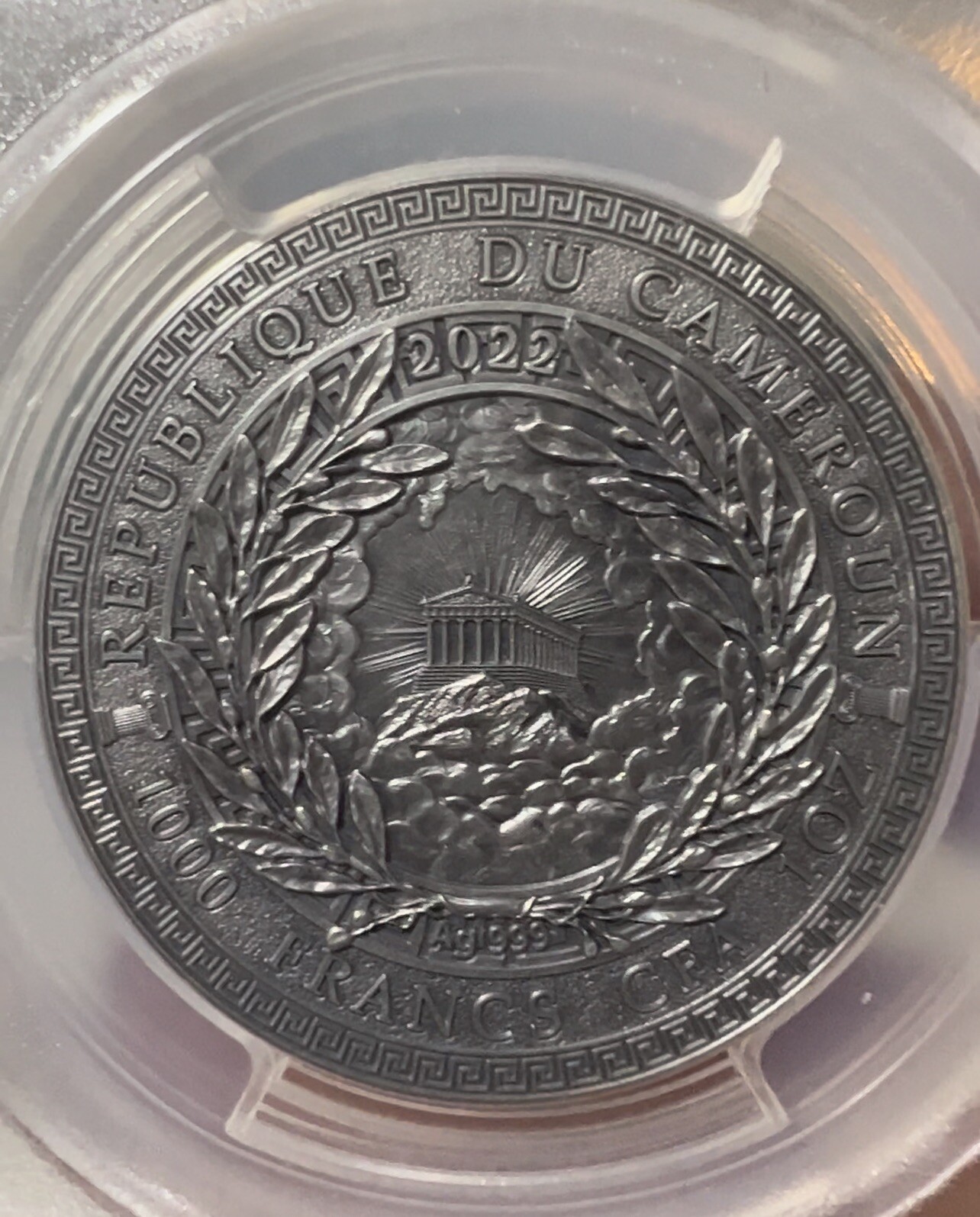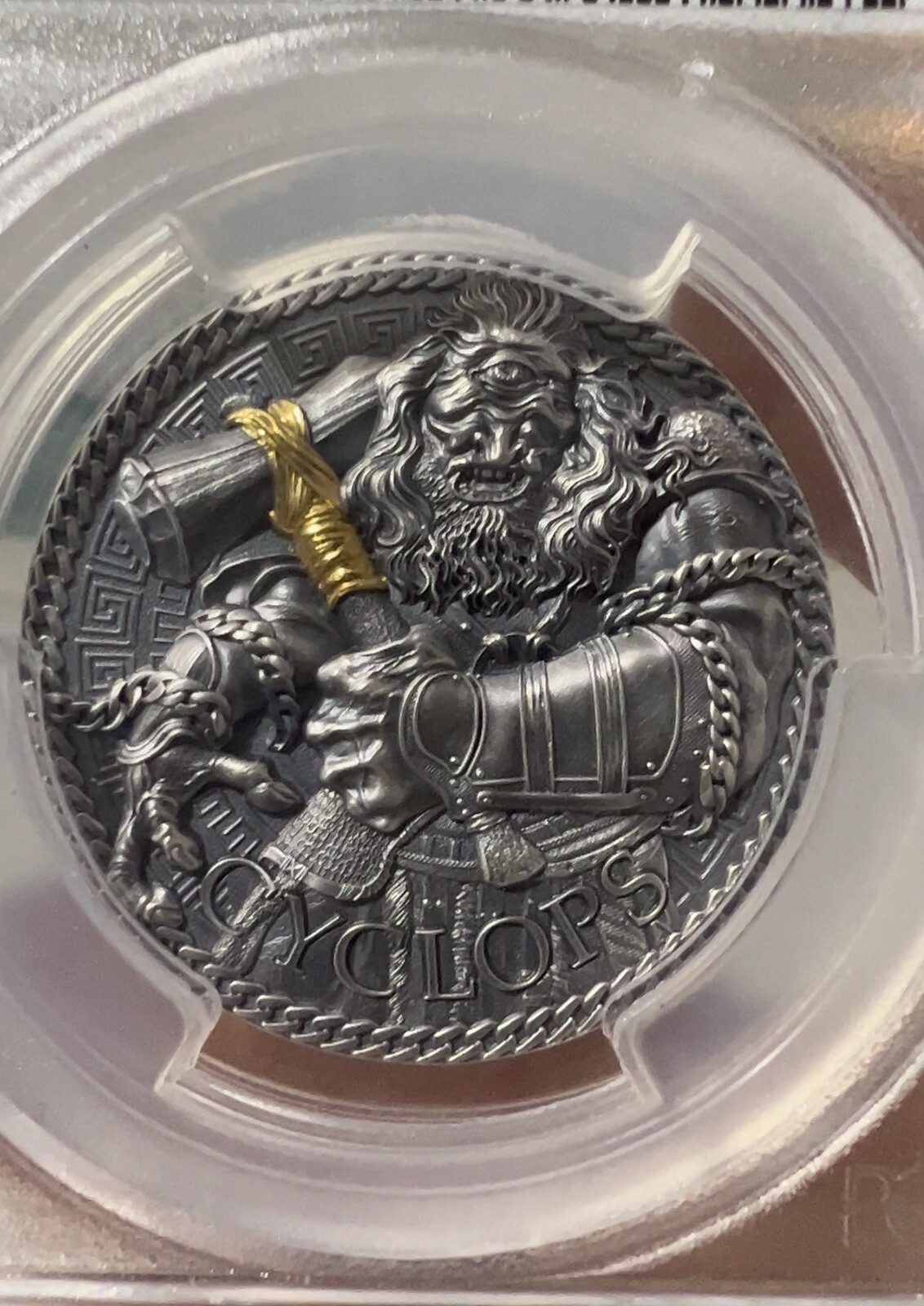 Description: Authenticated and protected and graded Cyclops Great Greek Mythology 1 oz Antique Silver Coin Cameroon 2022 PCGS 70. Coin Highlights: Contains 1 oz of .999 fine Silver. Mintage of 500 coins. Comes in a box with a certificate of authenticity. Obverse: Depicts the image of the Olympus surrounded by a laurel wreath. Inscriptions include the country of issue, face value and year of issue. Reverse: Features a detailed image of Cyclops, a creature with a third eye on his forehead. The Cyclops is holding a hammer which is partially gold gilded. Sovereign coin backed by the Republic of Cameroon government.