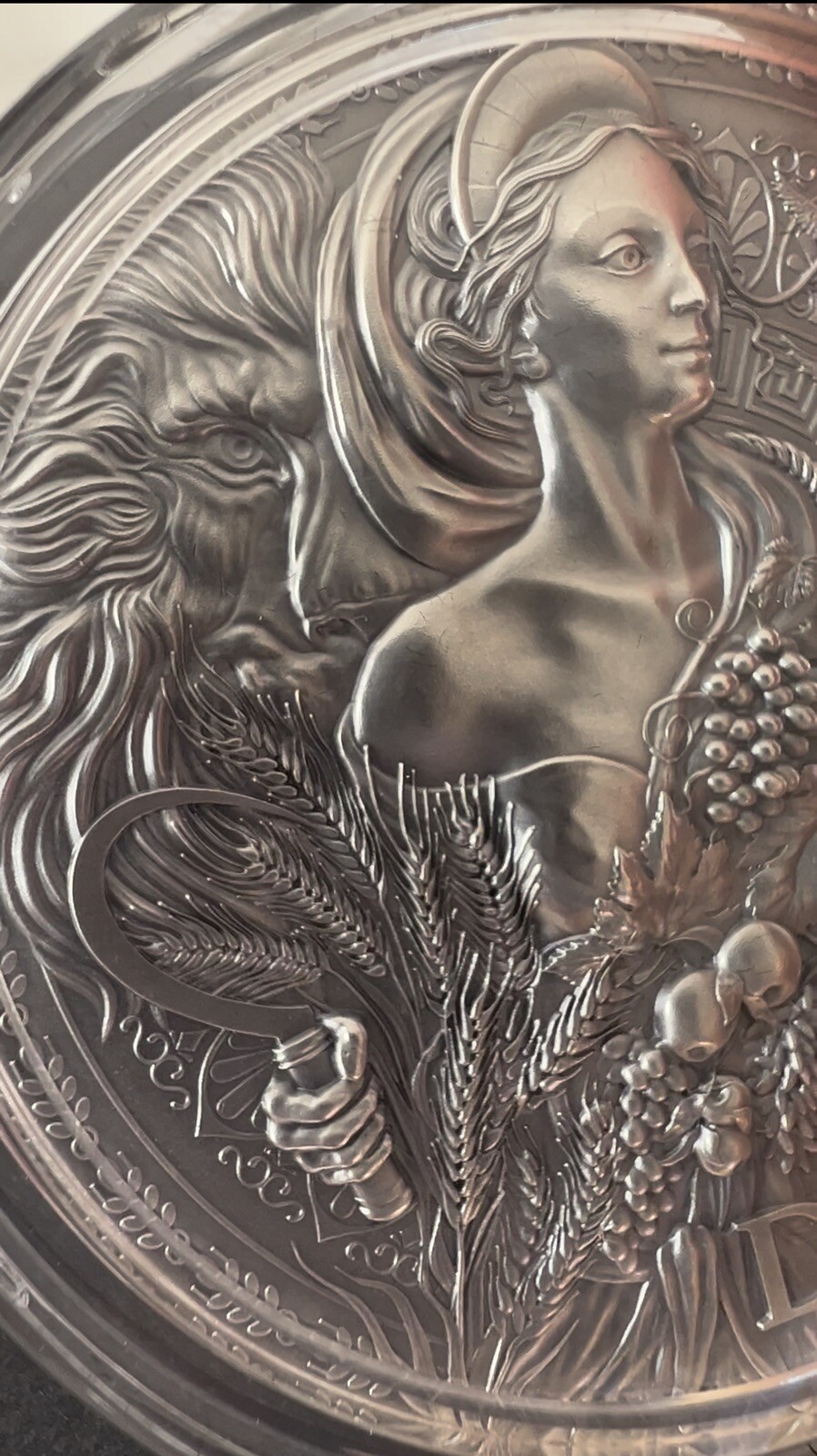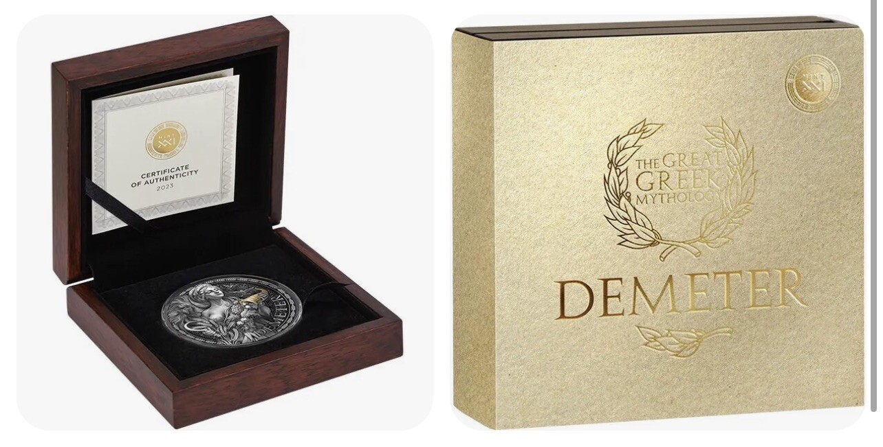 Description: Ready to ship Demeter The Great Greek Mythology 2 oz Silver Coin 2000 Francs CFA Cameroon 2023. DESCRIPTION Demeter β the goddess of fertility, the guardian of life. She personifies mother-earth, who helps the living and accepts the dead. She gives fruitfulness to people, fruits, plants, and animals. Demeter portrays a 50 mm coin in all her beauty and life, bearing a horn full of fruits and a sickle. To completely transfer the power that the wife of Zeus has, the lion stands right by her, and the birds fly around.