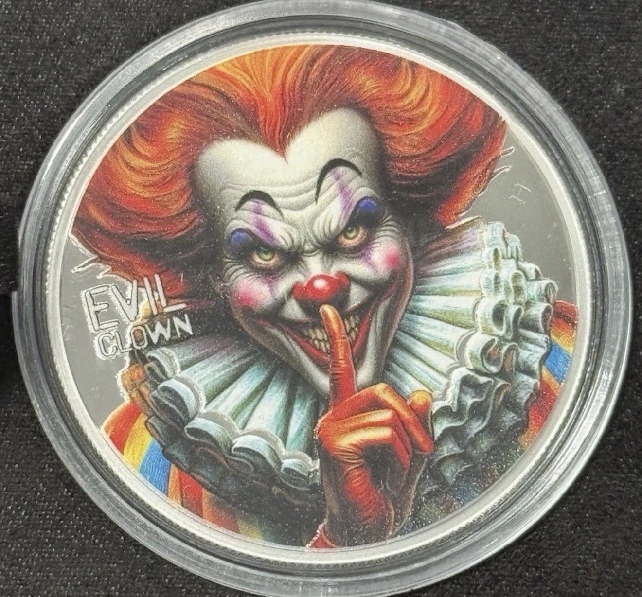 Description: The Evil Clown Urban Legends 1 oz Proof Silver Coin from Cameroon is a unique and collectible item minted in 2025. Featuring a striking proof finish, this coin is made of pure silver and weighs 1 oz. The design of the coin incorporates elements of urban legends and folklore, adding to its appeal to collectors and enthusiasts. This limited edition coin is a valuable addition to any coin collection, showcasing the rich history and culture of Cameroon through its intricate design and high-quality craftsmanship.