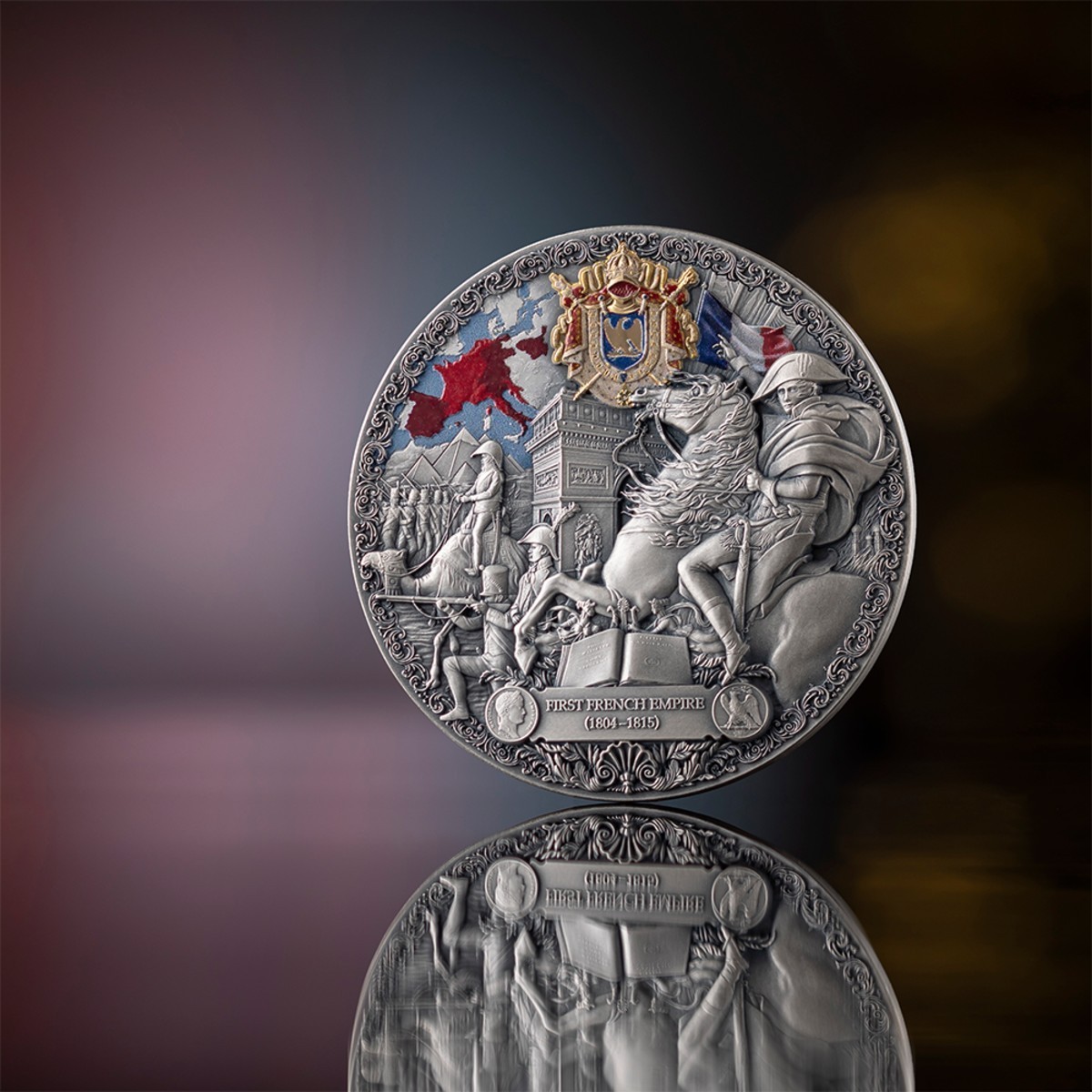 Description: FRENCH EMPIRE The Legacy of the Greatest Empires 2025 2000 Francs CFA 2 oz Pure Silver Antique Finish Coin. The empire’s golden crest gleams with selective gilding, while digital printing traces the expanse of French imperial power at its peak.