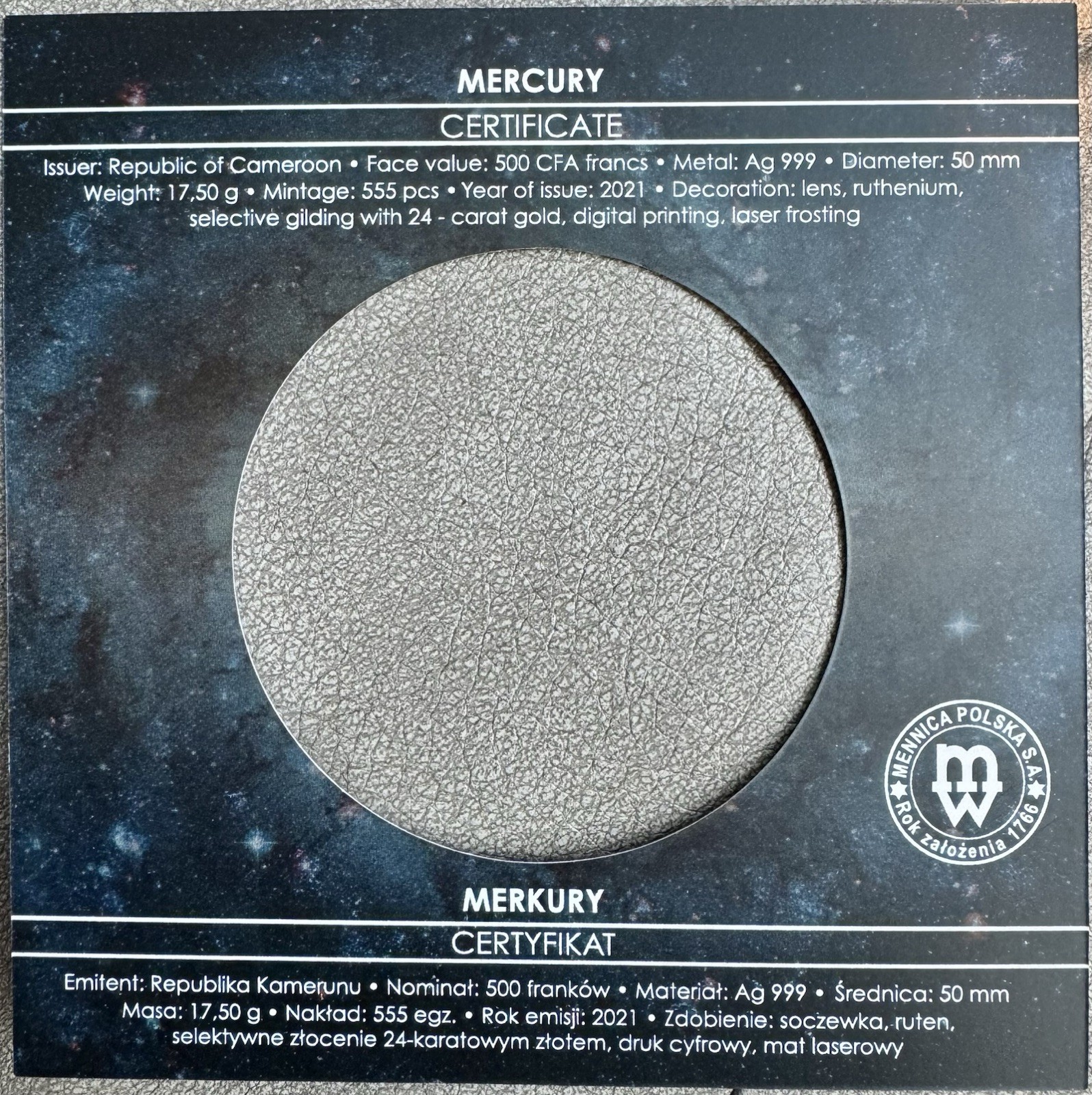 Description: The Mint Of Poland Mercury .999 Fine Silver Coin 500 Francs 2021 Cameroon is a beautifully crafted silver coin minted in Poland with a fineness of 0.999. Featuring a striking proof finish, this coin contains 17.5g of precious silver content per unit. With a limited mintage of 555 pieces, this coin is a valuable addition to any collection or investment portfolio. Made in Cameroon and certified by the Mint of Poland, this coin embodies both quality and craftsmanship in a stunning design celebrating the beauty of Mercury.