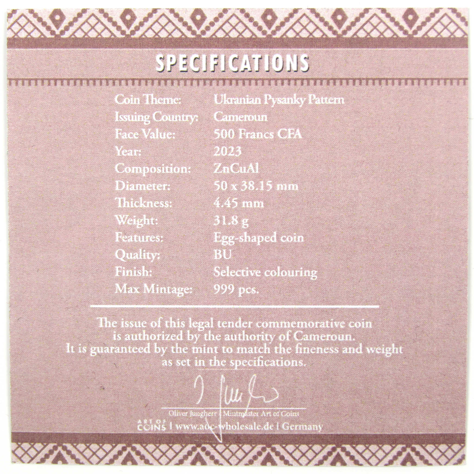 Description: A genuine 2023 Pysanky Pattern Egg-Shaped 500 Francs Coin, from Art of Coins. BU with selective coloring. Copper-Nickel (ZnCuAl) composition. Coin Type Pysanky Pattern Egg-Shaped. Paper Money: US. Large Cents.