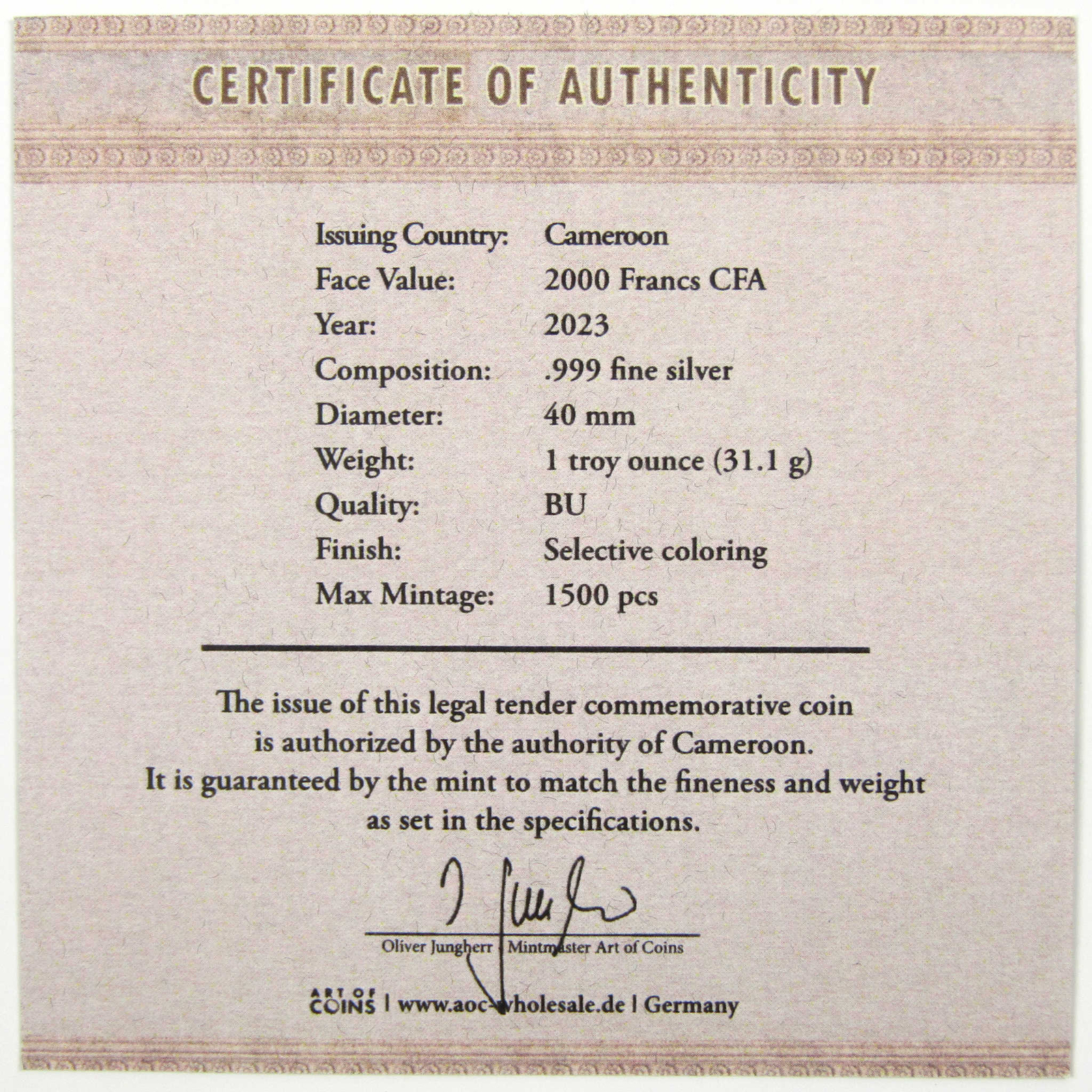 2024 Cameroon Peacemaker UHR Antiqued 1 oz Silver Coin