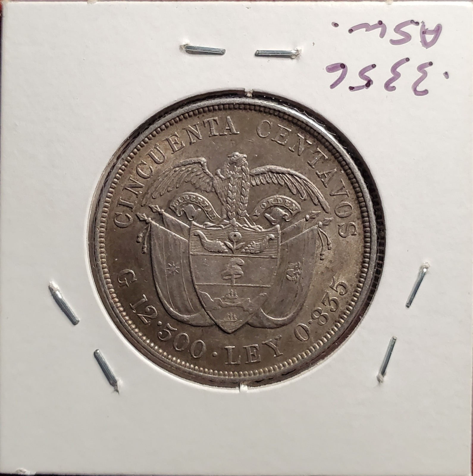 Description: 1892 Columbia 50 Centavos silver coin in AU-UNC condition with very sharp details.