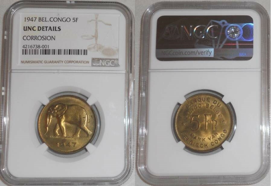 Description: The coin depicts an African elephant moving left on the obverse with the date below. The reverse shows the denomination flanked by stars and indication that the coin if from the Bank of Belgian Congo.