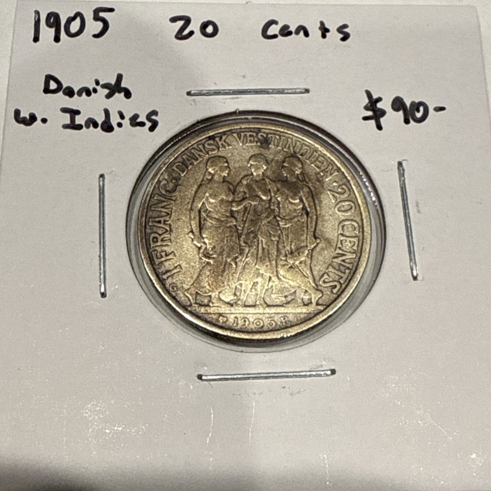 Description: The product is a 1905 20 Cent Danish West Indies Silver Twenty Cents Coin. This coin was minted in Denmark and is composed of 80% silver. It is circulated and has not been graded or certified. The coin features a unique design reflecting the history and culture of the Danish West Indies. This piece of numismatic history offers a glimpse into the economic and political landscape of the region during the early 20th century.