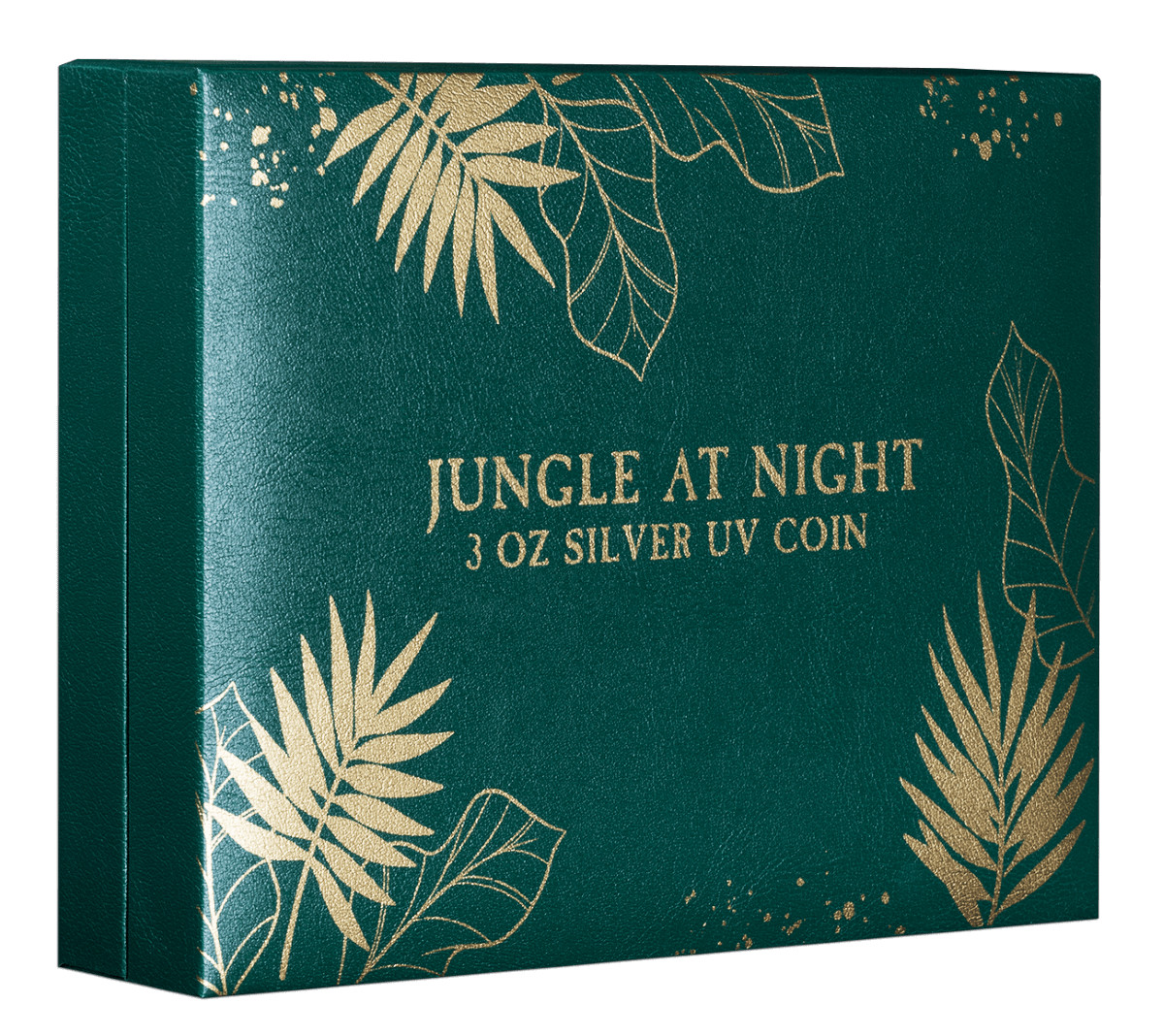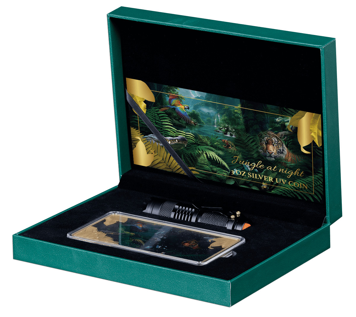Description: Finish: Colorized, Gilded. Year: 2025. Face Value: 50 Francs. Country: Djibouti. A special UV torch is included to reveal the coinβs vivid colors and bring the jungle to life like never before! 3 oz Silver β Jungle at Night.