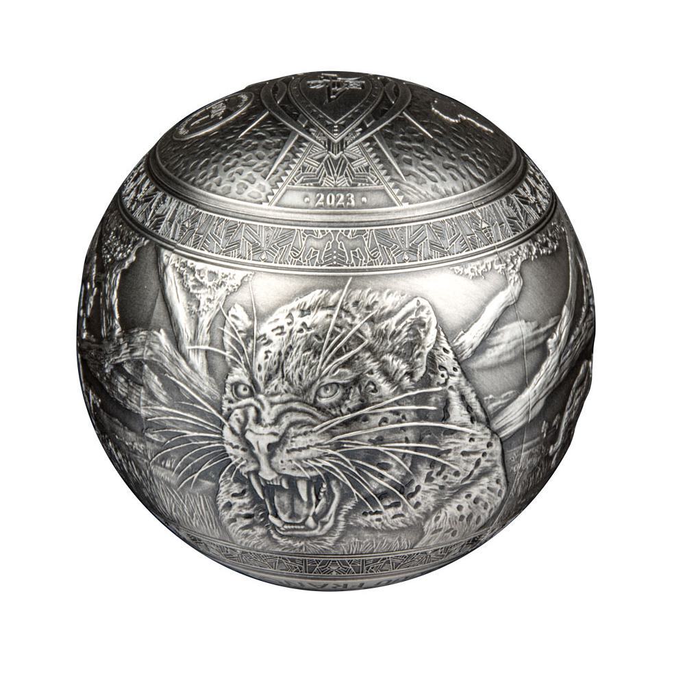 Description: The Big Five Spherical series issued by the Republic of Djibouti is an homage to the five most iconic creatures that roam the savanna of Africa: the lion, leopard, elephant, rhino and buffalo. This 2023 dated 1 kilo silver coin is dedicated to the African Leopard.