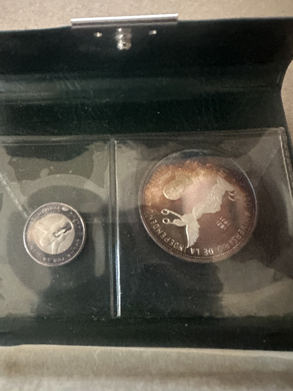 Description: The product is a set of two 1971 El Salvador 900 silver 1 and 5 colones proof coins, each containing 90% silver. The coins come with a display sheath and a Certificate of Authenticity (COA). The coins are uncirculated and struck with a proof finish, making them highly collectible items for coin enthusiasts. The silver coins are a valuable addition to any collection, especially for those interested in Central American numismatics.