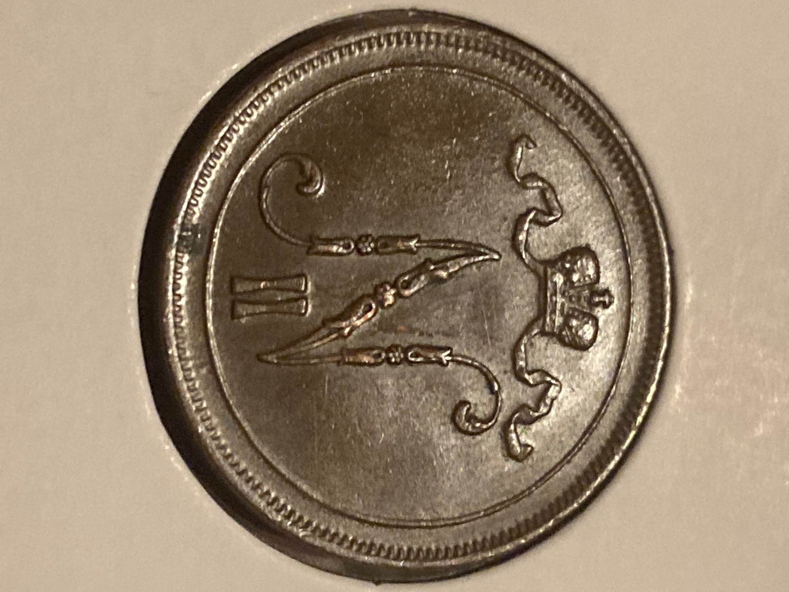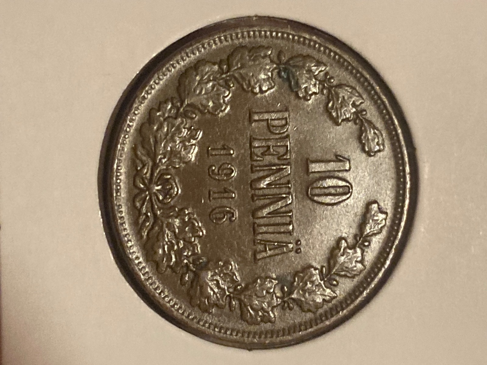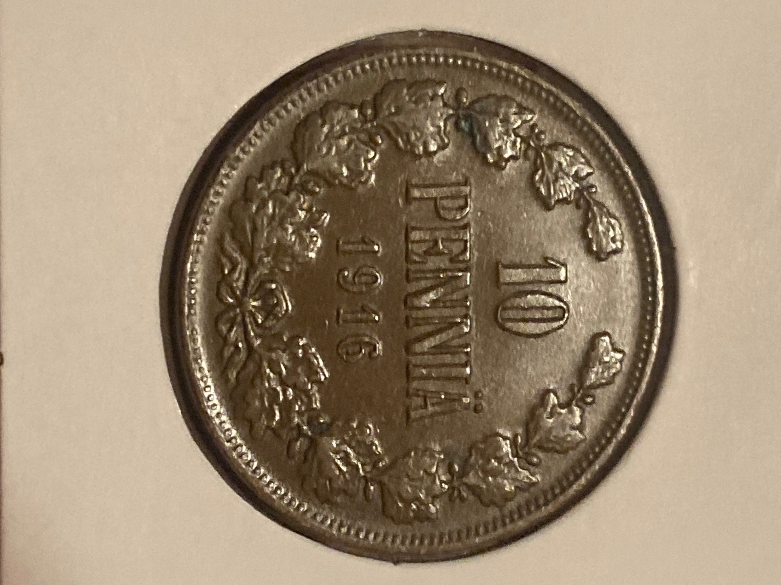 Description: The 1916 Finland 10 Penniä coin is a circulated copper coin from Finland with a denomination of 10 Penniä. It was minted in 1916 and is listed with the KM#14 catalog number. The coin features a brown color (BN) and is uncertified. This historical piece of currency from Finland is a valuable addition to any coin collection or as a unique gift for someone interested in European numismatics.