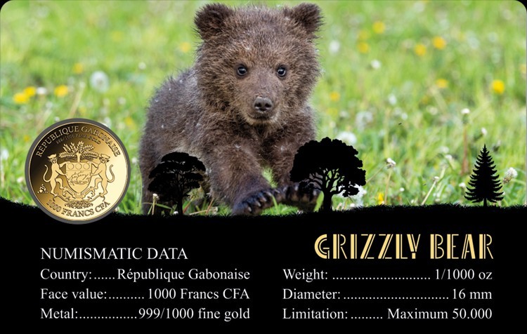 Description: Gabon Grizzly Bear 1/1000 oz Gold Coin in Card. Shipped with UPS Ground.