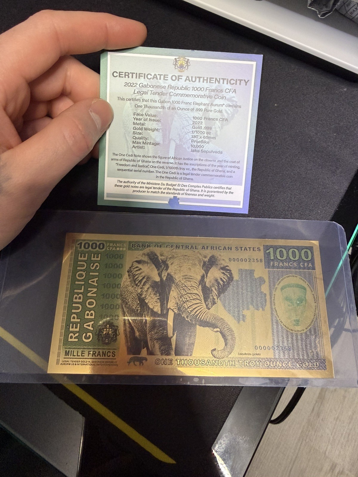 Description: The product is a 1000 Francs note from the Republic of Gabon, with a denomination of 1/1000 oz of 24 KT gold. This unique piece of African paper money features French language text and is a valuable addition to any collection of world coins and paper money. With a focus on the year 2022, this note signifies the current economic landscape of Gabon in French Francs.