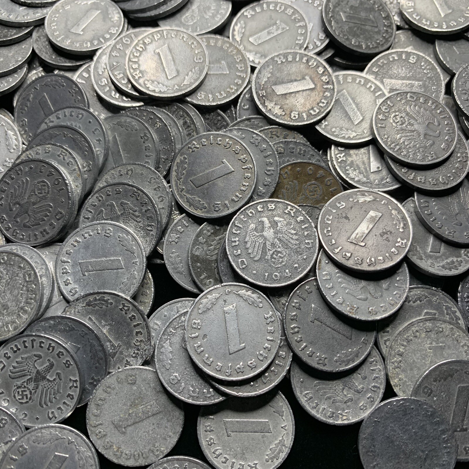 Description: The zinc 1 Reichspfennig coins were minted by Germany between 1940 and 1945 during World War II, replacing the bronze-aluminum versions, which had a distinct golden color. Most have clearly visible details.
