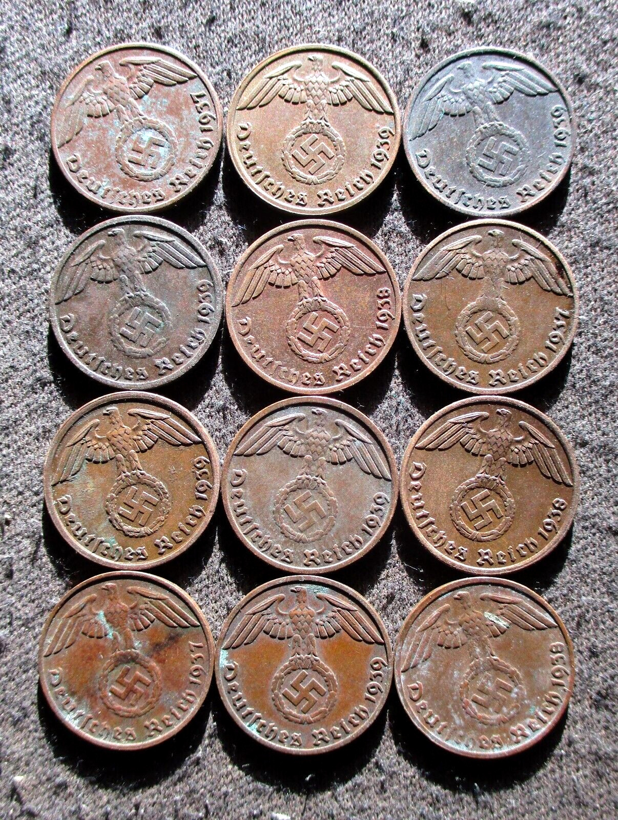 Description: OF THE THIRD REICH GERMANY. WORLD WAR II. LOT OF TWELVE OLD 1 REICHSPFENNIG COINS.