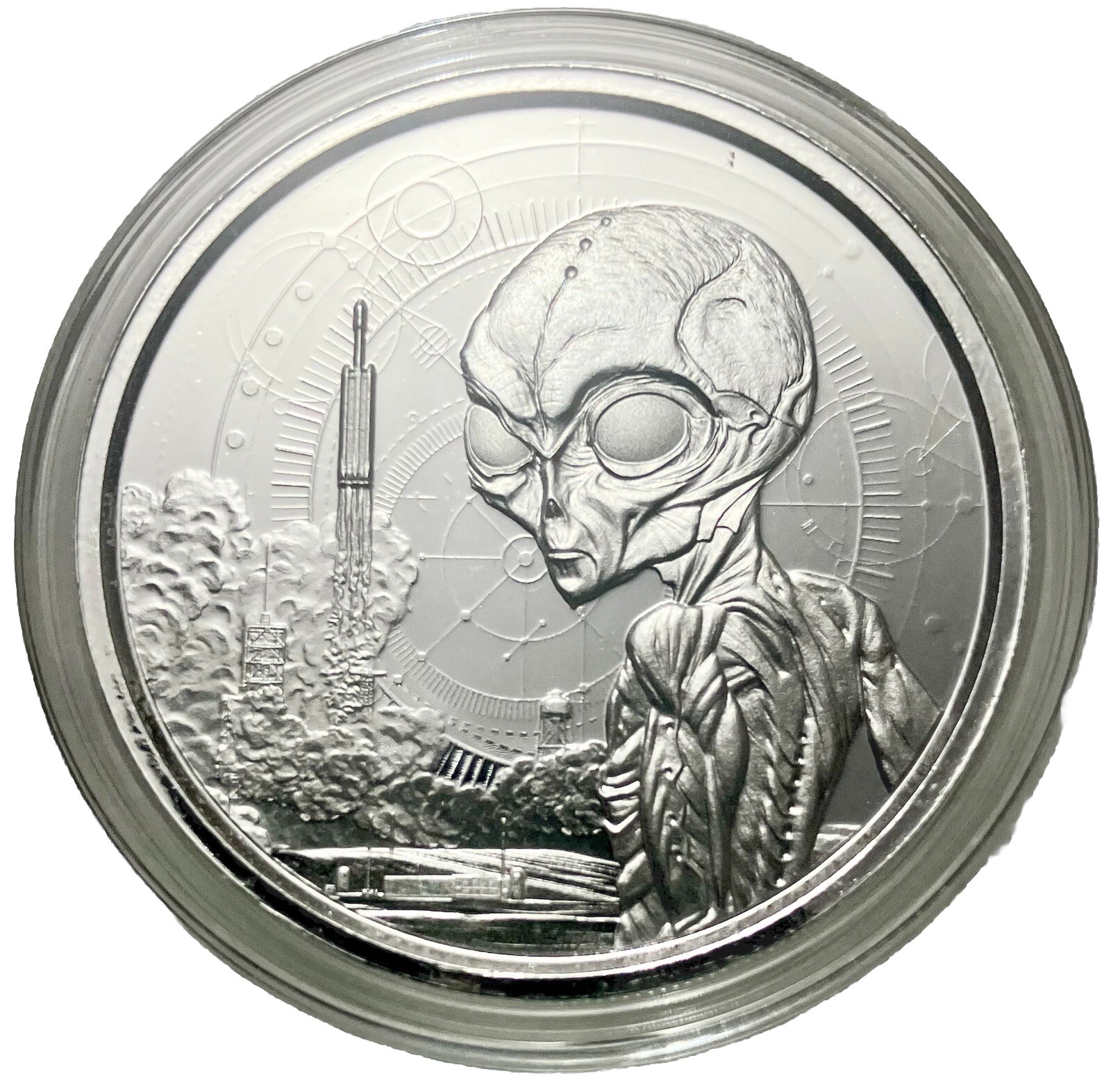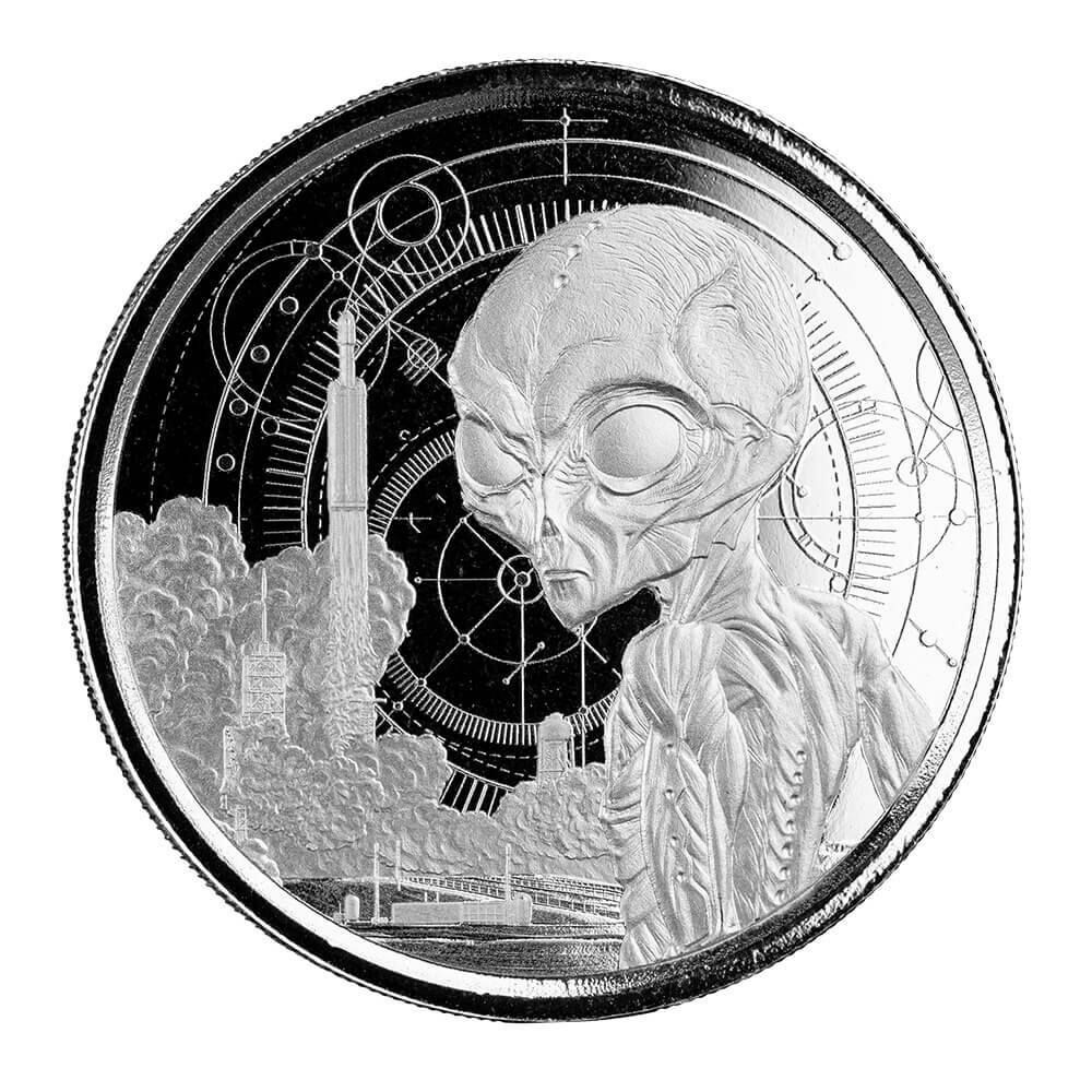 Description: 2021 1 Oz Republic Of Ghana Silver Alien Coin – Limited Mintage 25000 In Capsule. The 2021 Ghana Alien includes an Alien ET staring and space rockets launching behind him. It’s released as governments around the world begin soft disclosures including UFO videos and unexplained NASA findings. – 1 Troy Ounce | 999 Fine Silver – Legal Tender in Ghana ($5 Cedi ) – Limited Mintage: 25,000 – Quality: BU – Comes in Tubes if ordered in increments of 20 units – Diameter: 39 MM