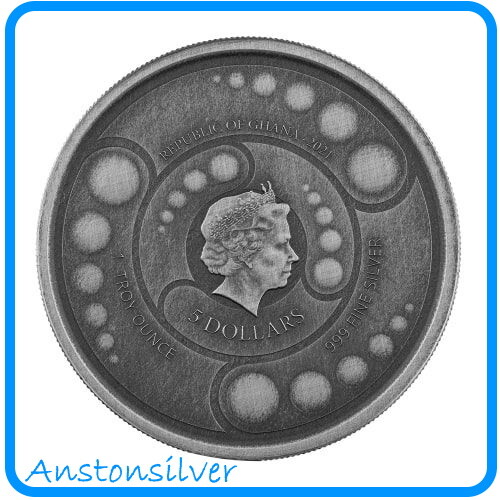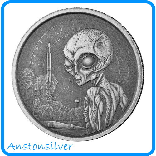 Description: Year: 2021. Reverse : depicts an alien in front of a rocket shooting out from Earth, with a futuristic design in the background. Her Majesty also includes the issuing country, year, weight, denomination, and quality.