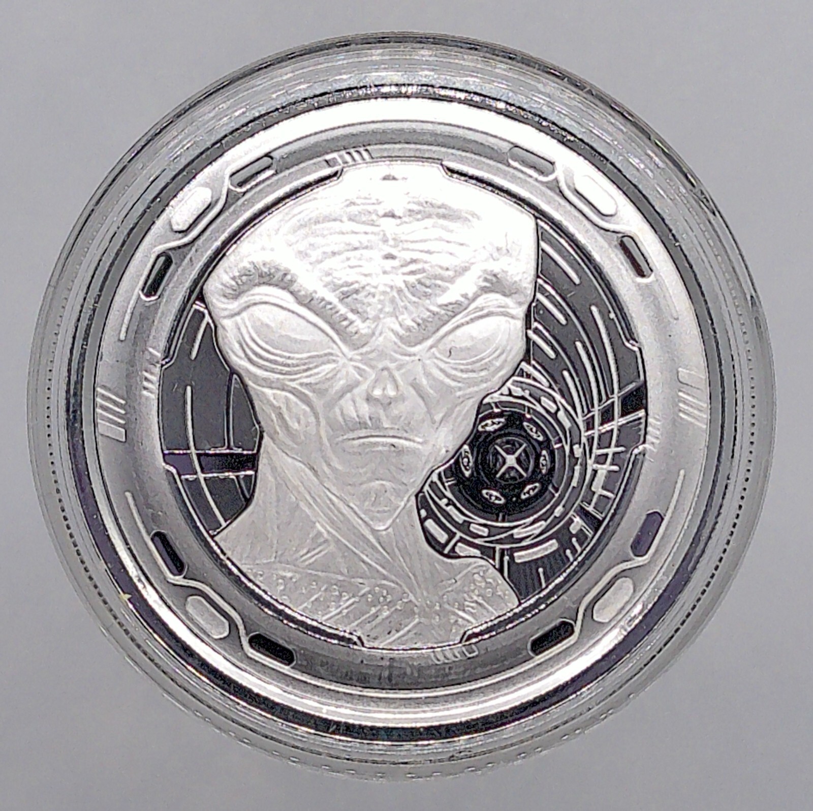 Description: This stunning coin from Ghana features a beautiful design of Elizabeth II on the obverse and a mysterious Alien on the reverse. Minted with .999 fine silver. The strike type is proof, and the coin is ungraded and uncertified. The coin is composed of silver, and was minted in 2022 by Scottsdale Mint.