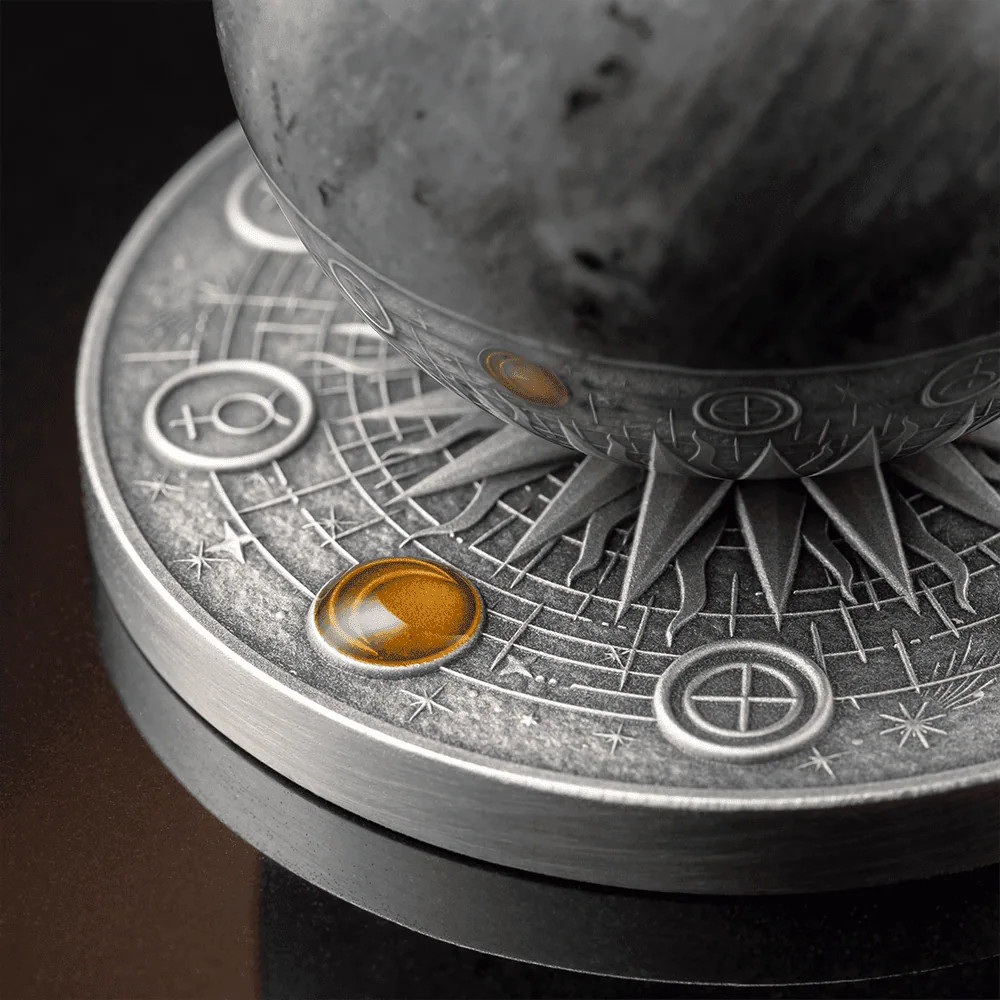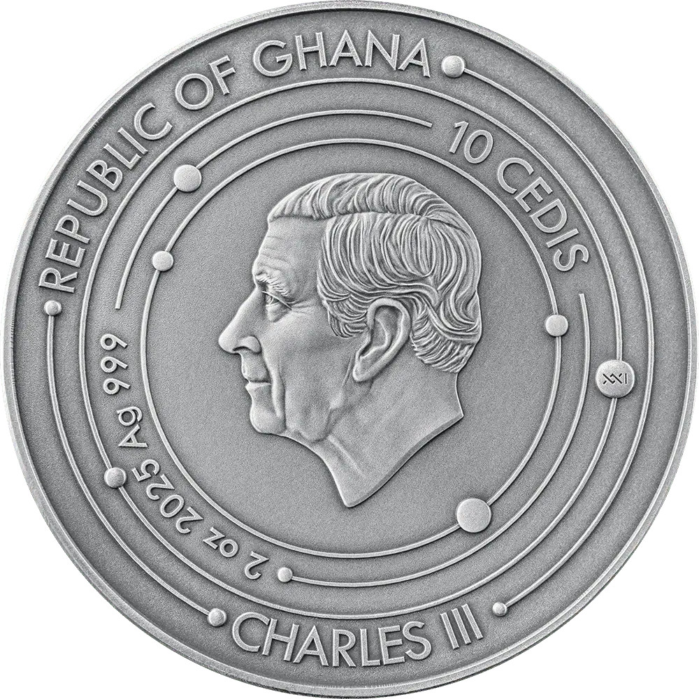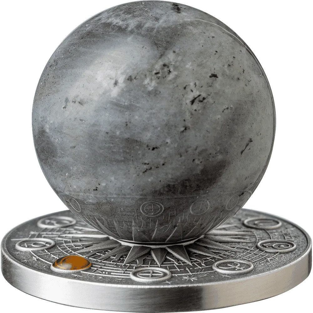 Description: The “2025 Ghana Solar System Moon 2oz Silver Antiqued Labradorite Spherical Coin” is a unique collectible coin that is part of the “Solar System” series. The coin features a 35mm Labradorite sphere that represents the Earth’s moon.